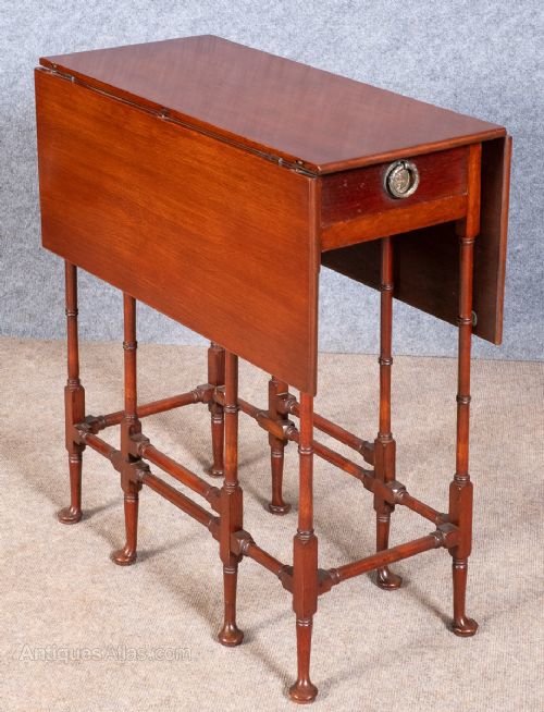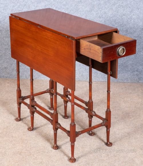A George III style mahogany drop leaf occasional table with end drawer sometimes referred to as a spider table. The drop leaves when lifted are supported by the gate leg action. The base having 8 ring turned supports with turned stretchers and standing on 8 pad feet. In very good condition. Dimensions:- Height...28''/ 72cm. Width...26.25''/ 67cm. Depth closed...12.25''/ 31cm. Depth open...33''/ 84cm. Delivery to most of U.K. mainland £38.