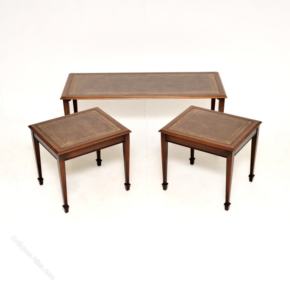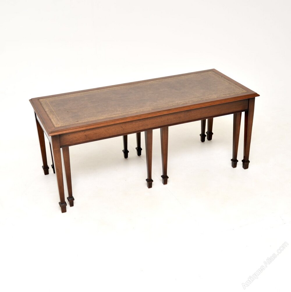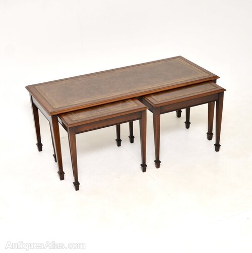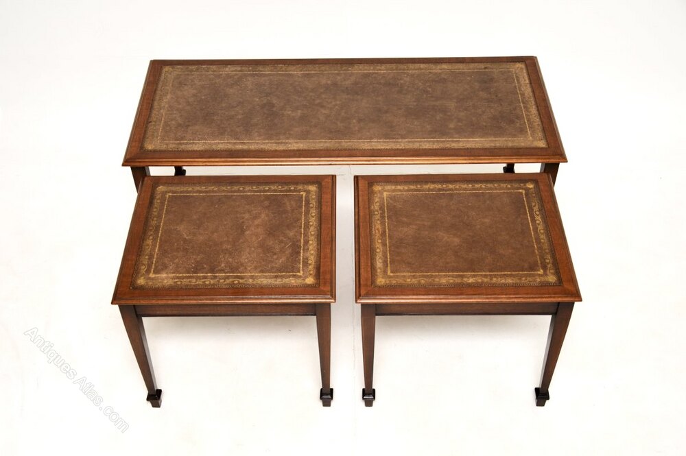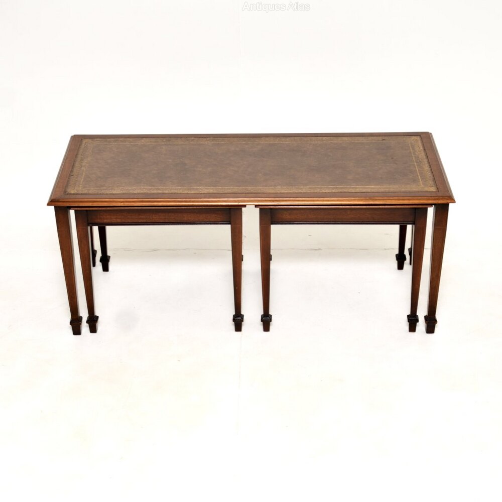 A wonderful antique mahogany leather top nesting coffee table / side tables. These were made in England, they date from around the 1900-1920 period.