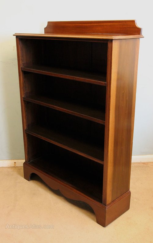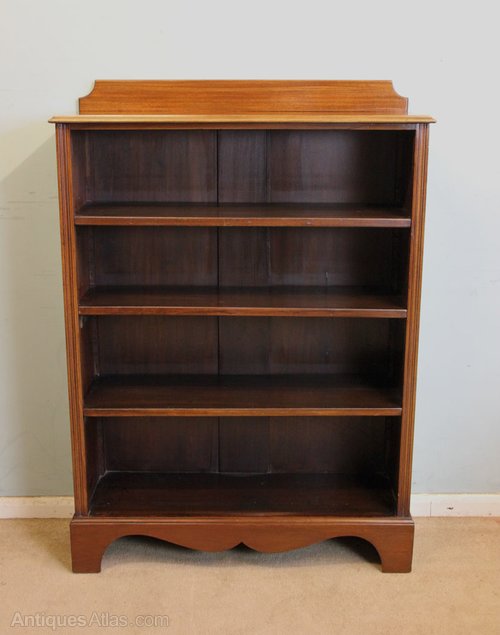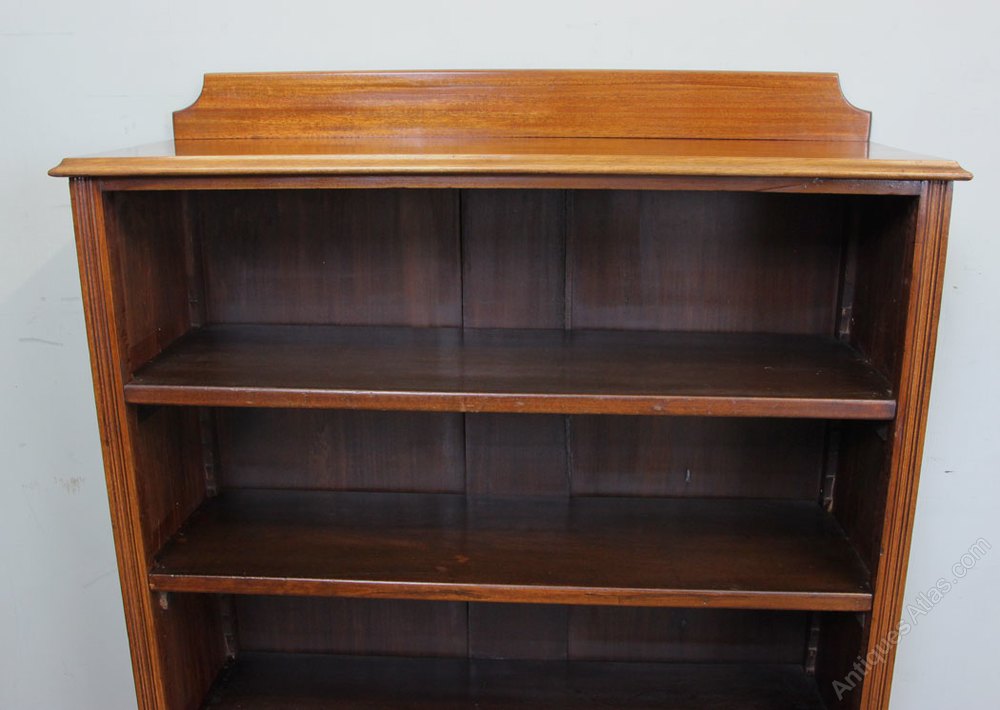 Antique Edwardian Mahogany Open Bookcase. This Edwardian mahogany open bookcase has a low up stand to back with moulded edge to the top. Under having three adjustable shelves with reeded decoration either side. All supported by a shaped base and feet.