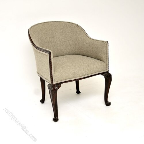 The mahogany frame has been re-polished and upholstered in a high quality Harris Tweed grey wool fabric, the condition is excellent for its age.