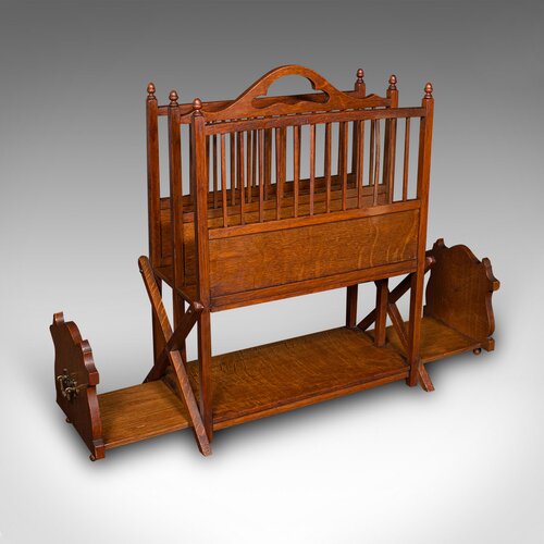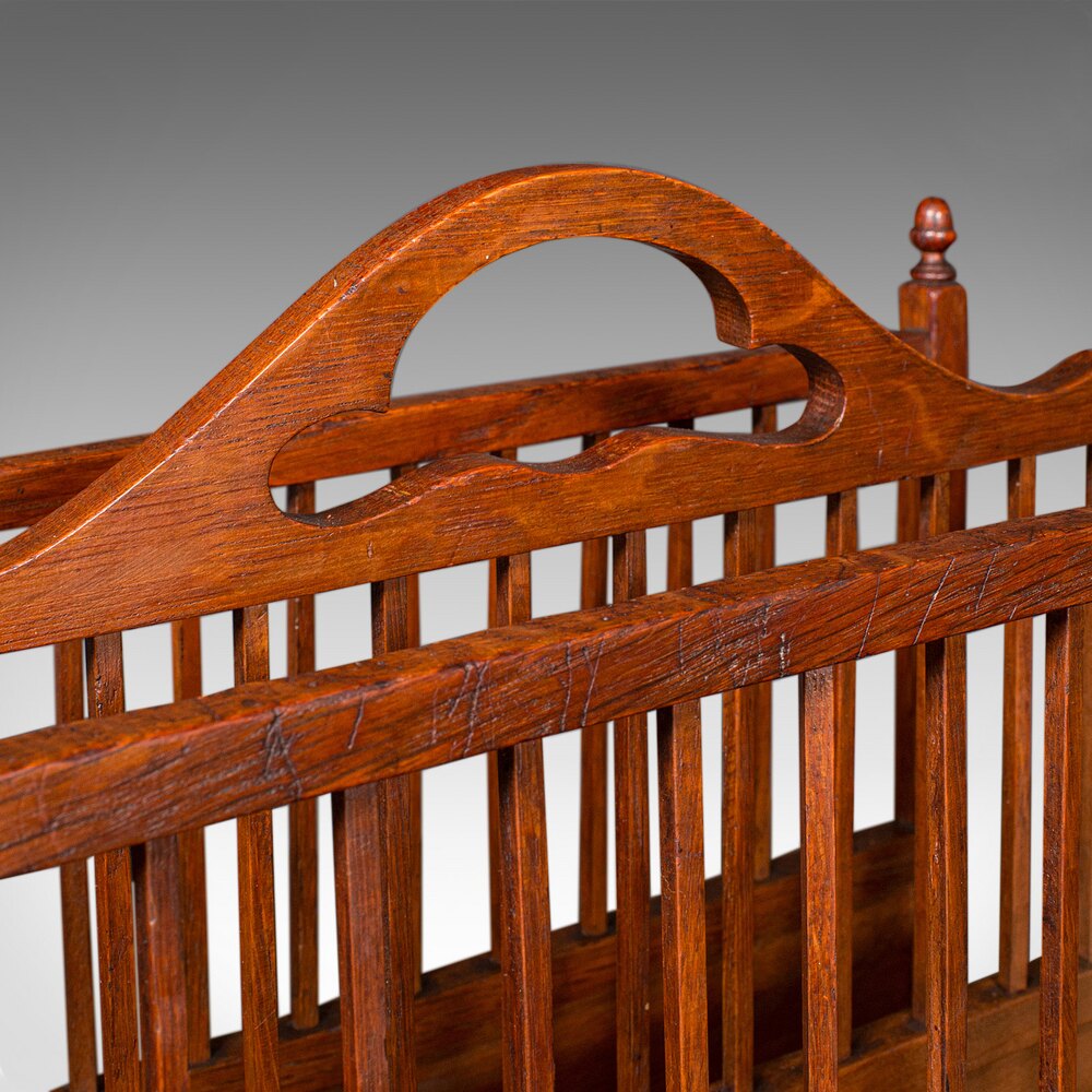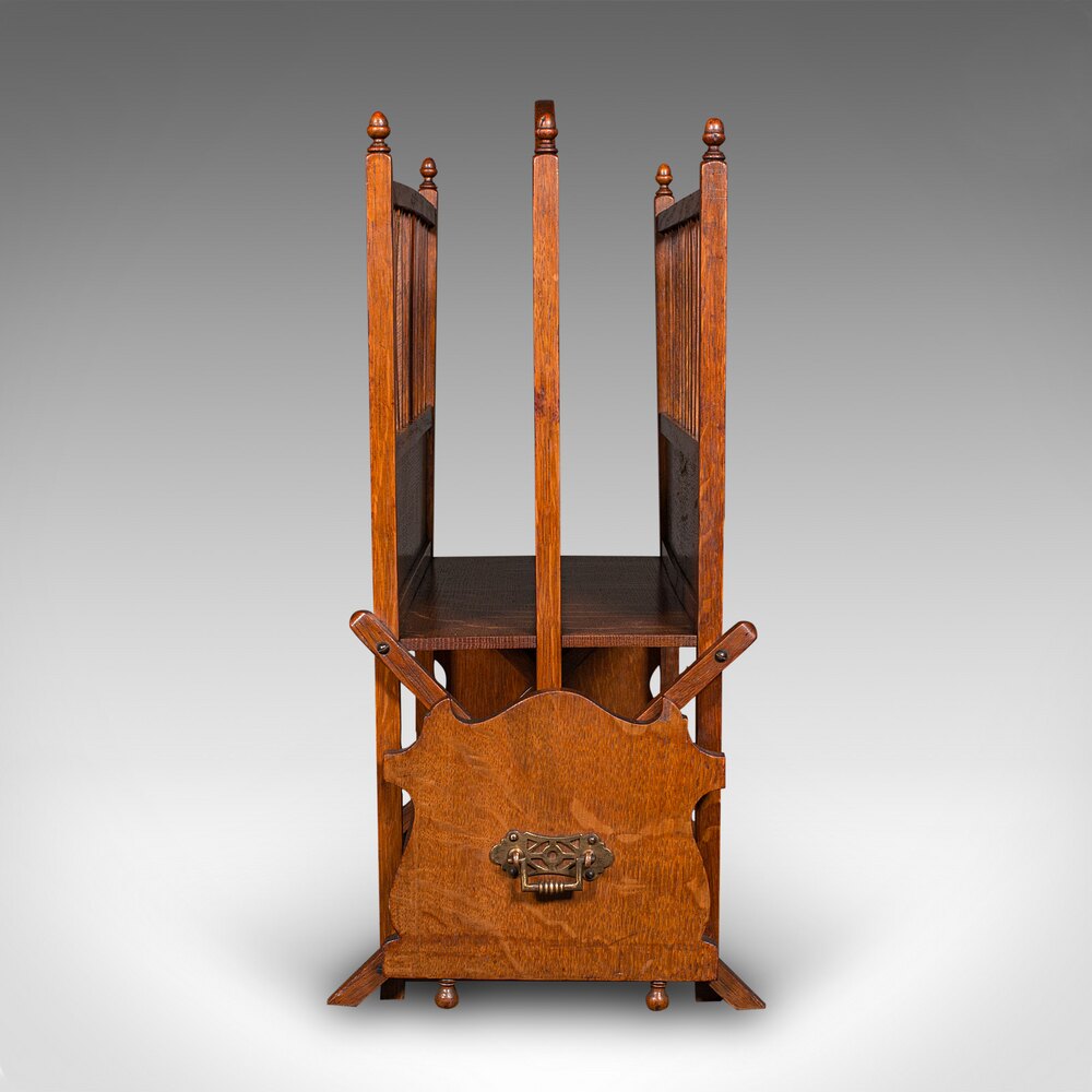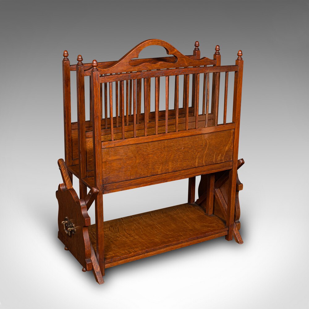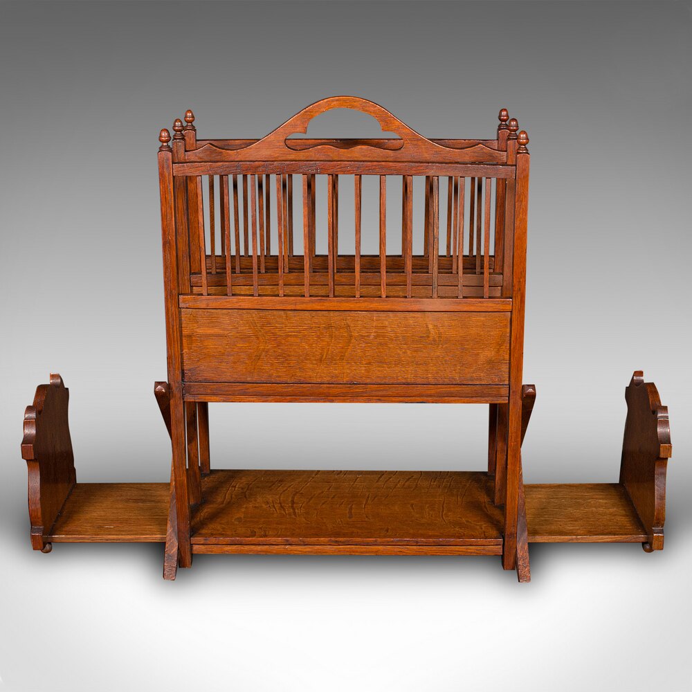 This is an antique metamorphic Canterbury stand, an English oak magazine rack with extending book slides, dating to the Edwardian period, circa 1910.