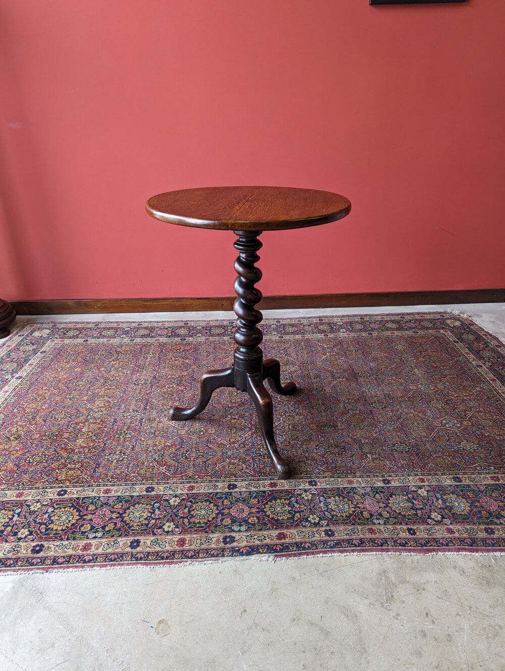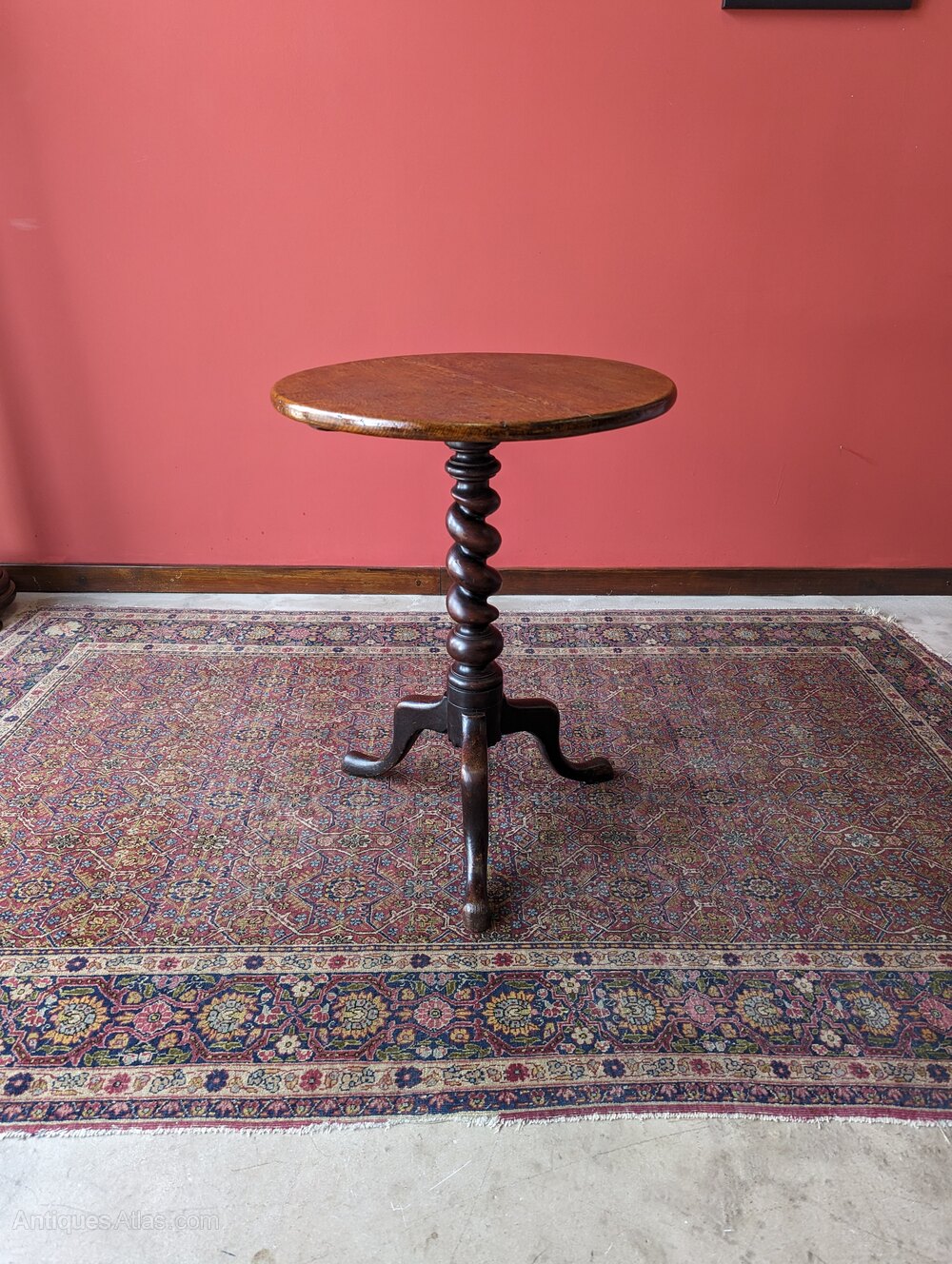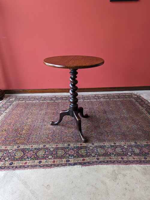 An early Victorian circular mahogany occasional table with a thick barley twist column pedestal leading to a tripod base.
