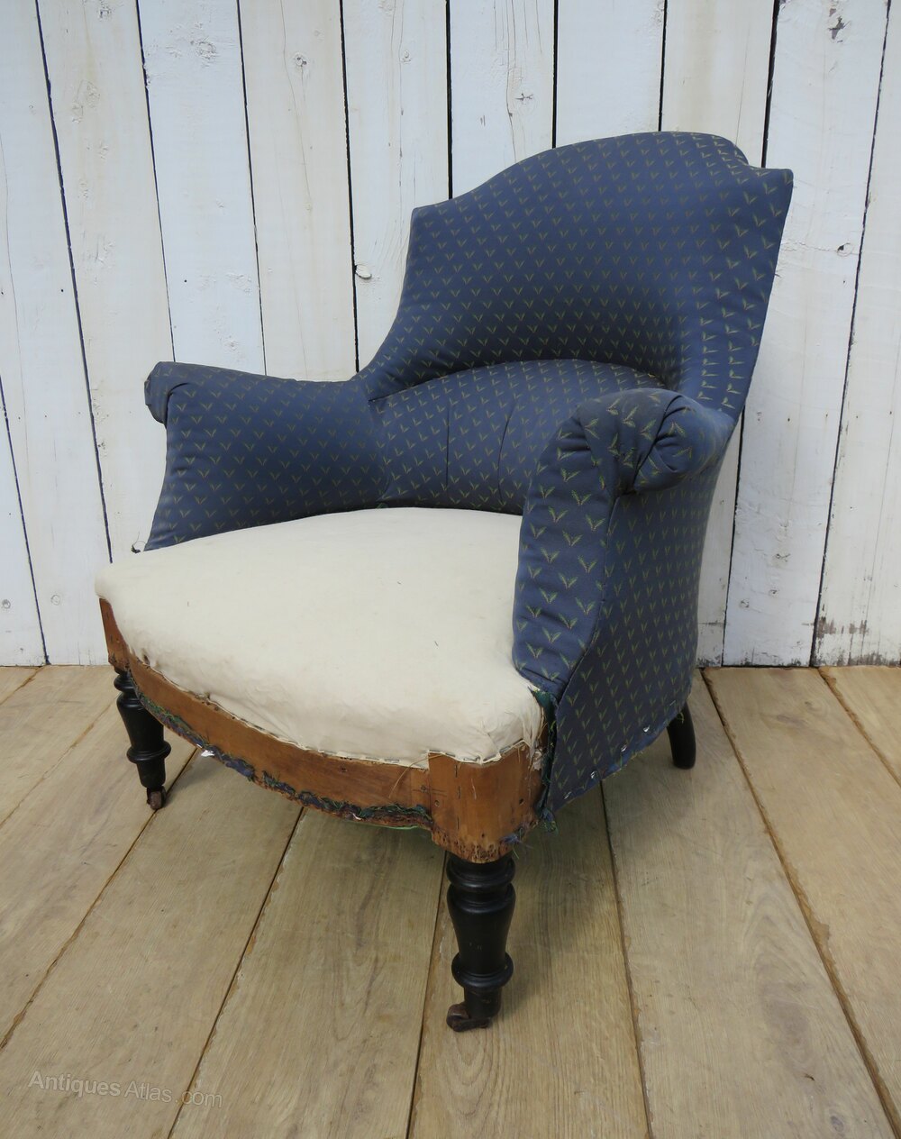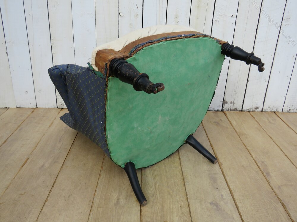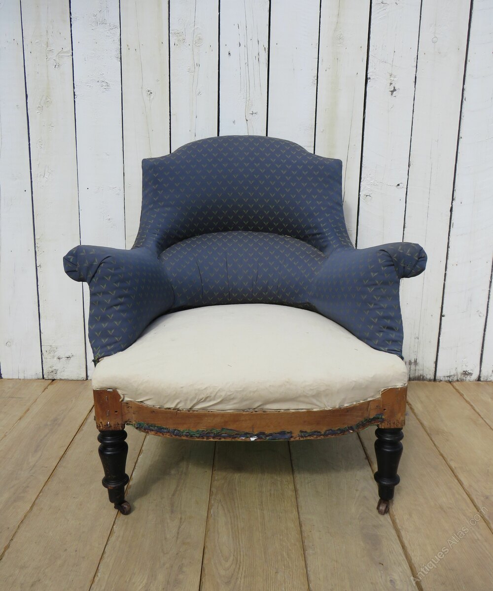 Shapely, sound, sturdy and sprung 19th century French serpentine fronted shield back Napoleon III tub armchair on ebonised legs and castors to the front for re-upholstery.