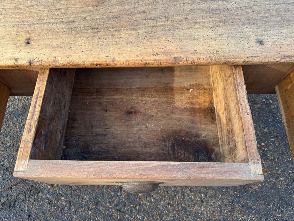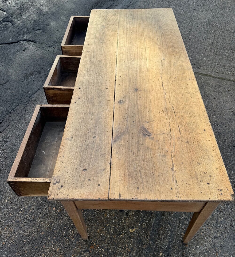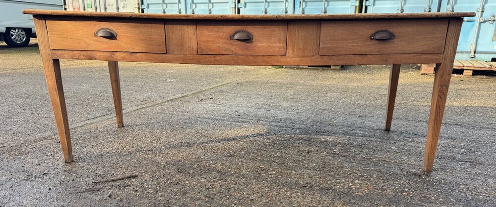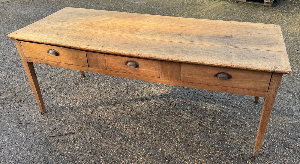 A good early French Kitchen Table from Normandy. Dating to the early 1800s and made from Elm. Having 3 good sized deep drawers to one side. We have lightly bleached it just to lighten the colour a little but kept the charm and character or the piece. Extremely useful either as a kitchen island, prep table or dining table. In overall good original condition.