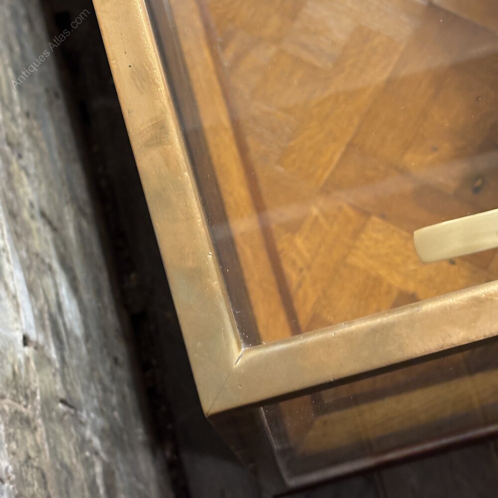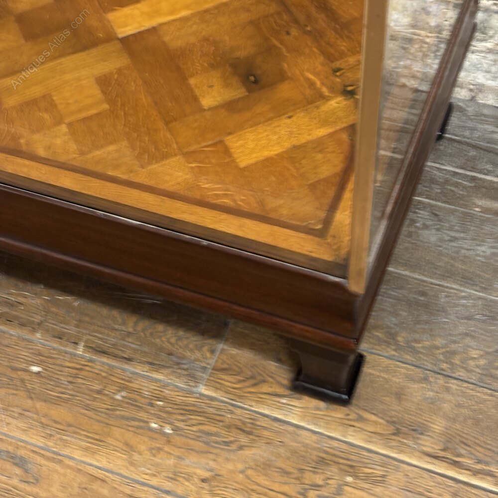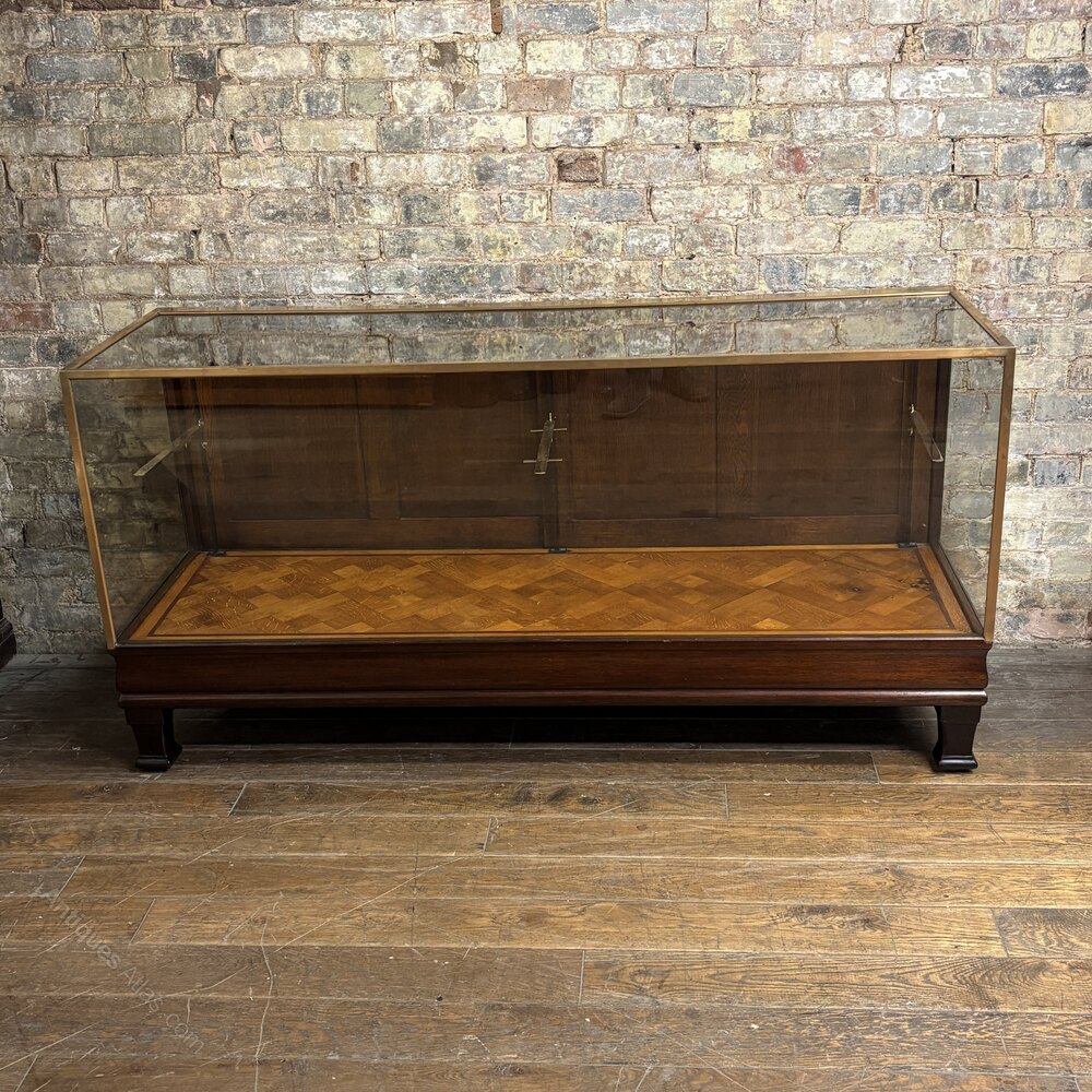 A stunning early 20th-century dark stained oak display counter with a brass-framed glass top and oak parquet inlaid flooring. Raised on shaped feet with a panelled back, this elegant counter was originally used in a tailor’s shop. Fitted with all new toughed glass.
