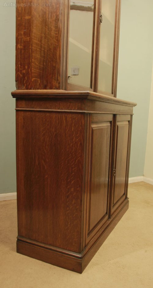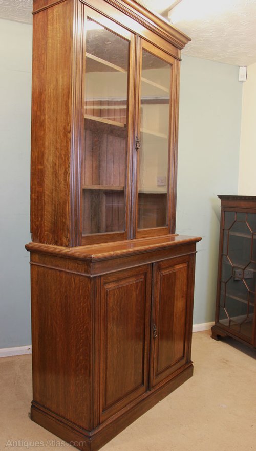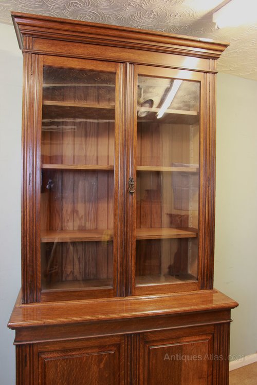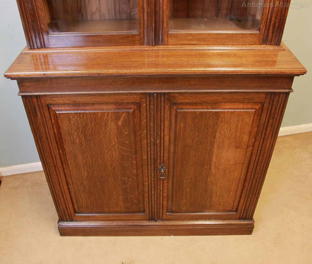 Antique oak two door glazed cupboard bookcase. This antique bookcase has a moulded cornice above two glazed doors the interior has four adjustable shelves. The base has a moulded top with two doors under with moulded panels all supported by a solid plinth and the interior to the base has a centre shelf. Date Circa 1900