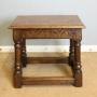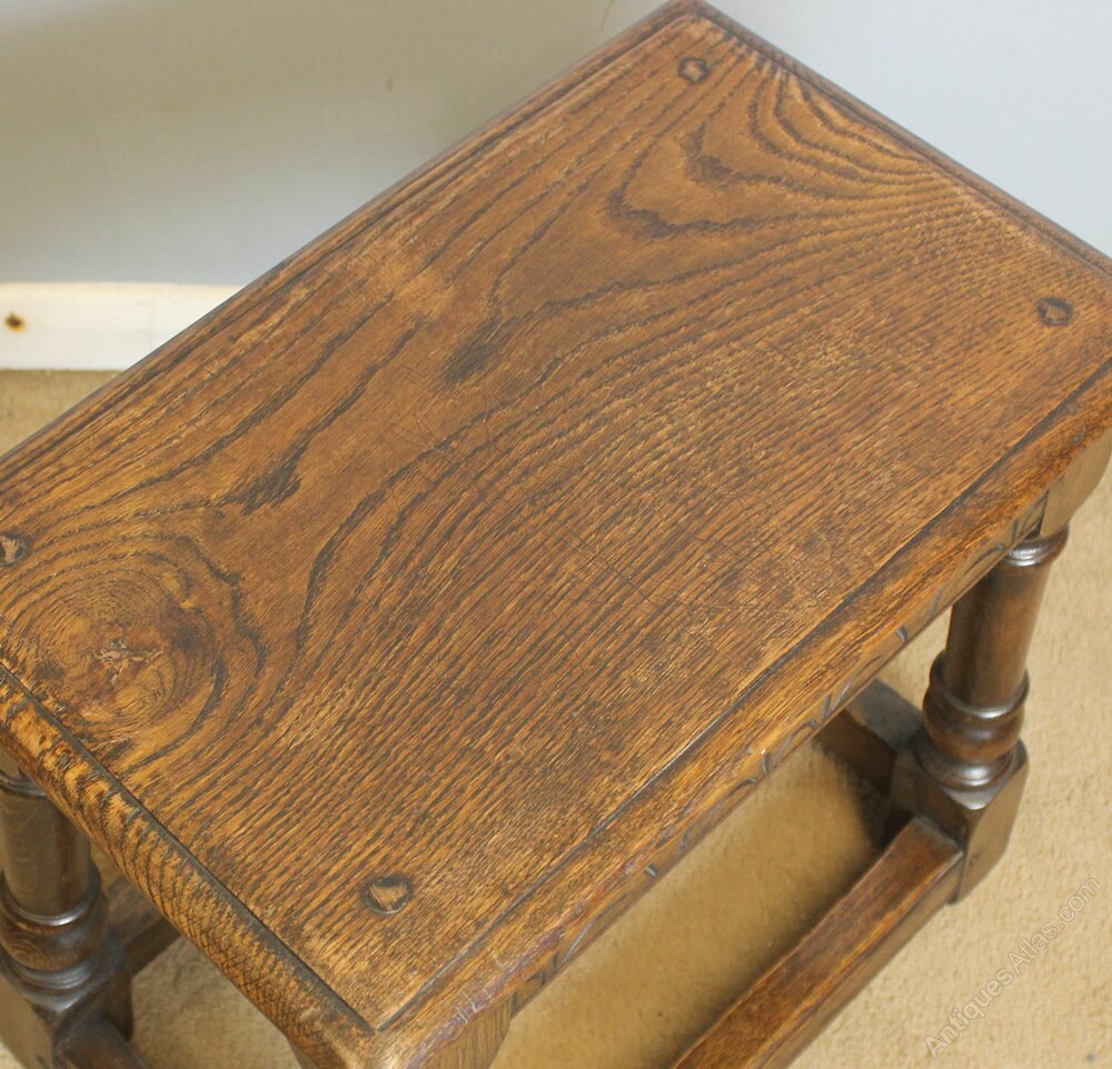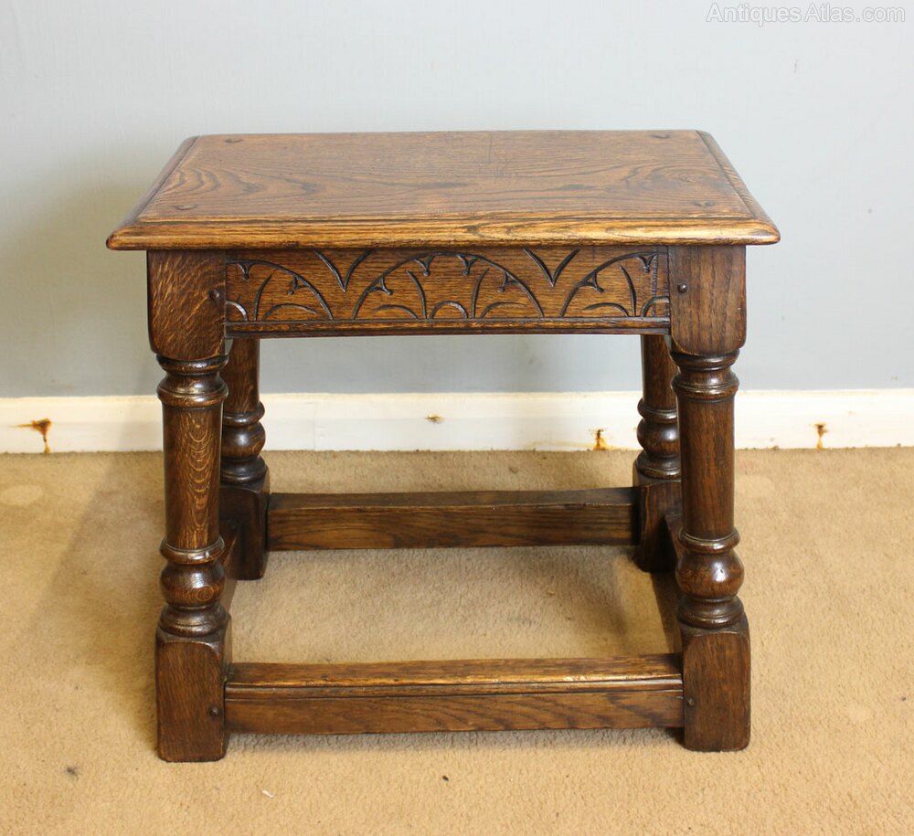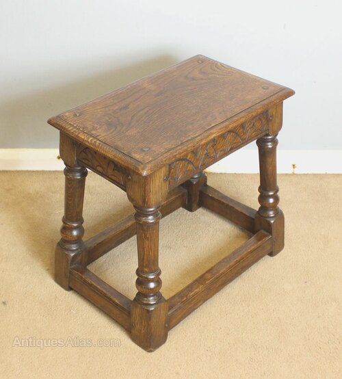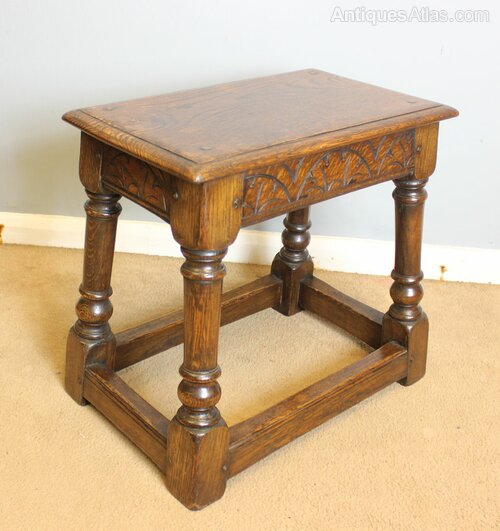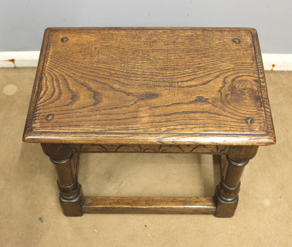 Antique Oak Joint Stool, Coffee Table. This solid oak joint stool / coffee table has solid oak top with moulded edge with a lovely carved frieze under. All supported by front & side stretchers and turned legs.