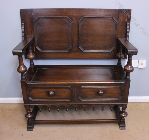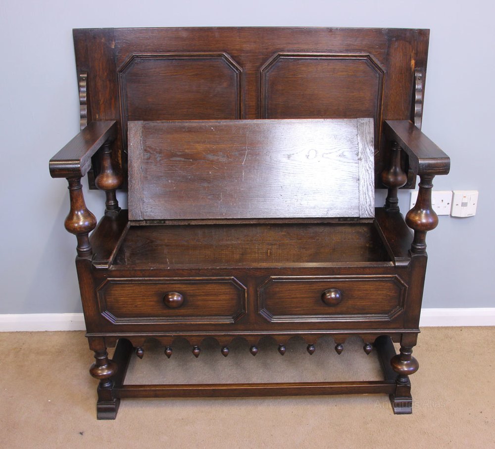Antique Oak Monks Bench. This oak monks bench / hall seat / settle has a panelled back with turned arm rest supports the seat lifts for storage with two shaped panels under and decorative shaped finials below all supported by turned short legs with front back and side stretchers.