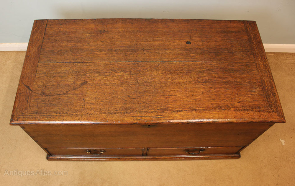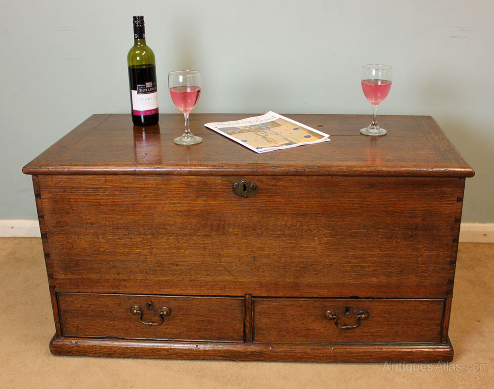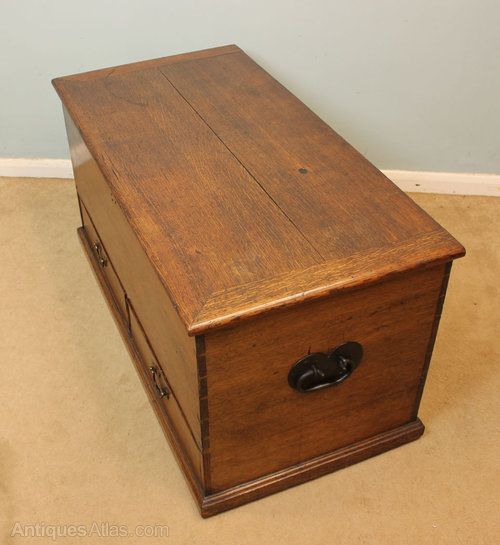 Antique Oak Mule Chest, This Victorian oak mule chest / coffer / coffee table has a plank top, with key escutcheon and two swan neck handles for the drawers below, The two drawers are locked by a locking mechanism inside the chest, Having metal carrying handles to the side standing on a solid plinth base. This piece is polished all round, Circa 1850