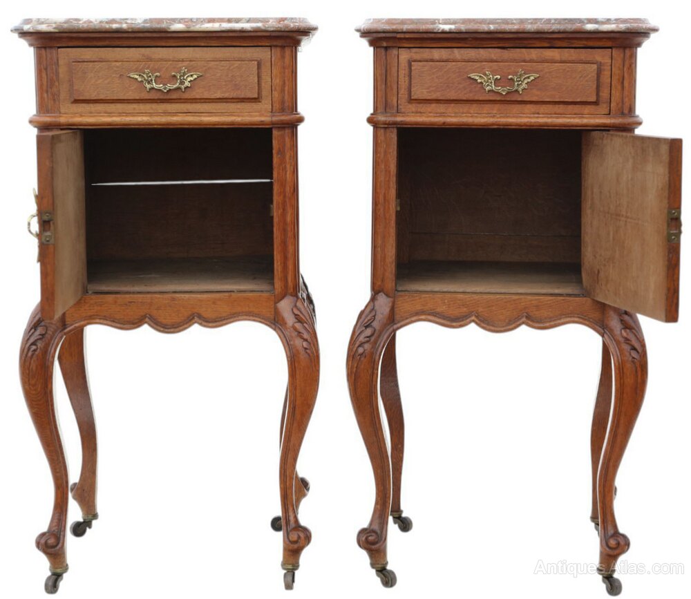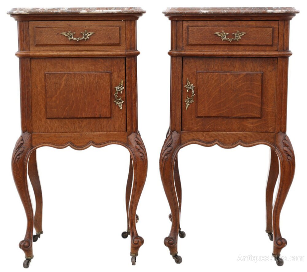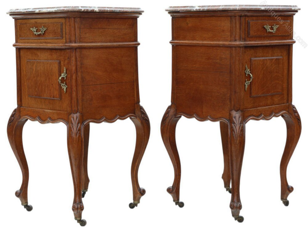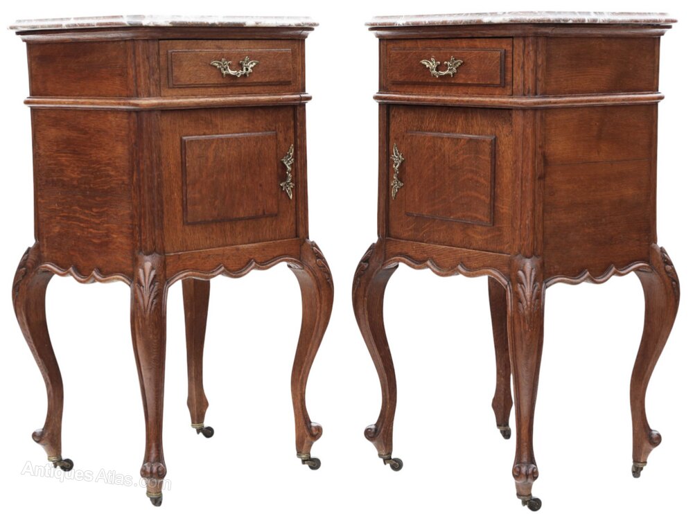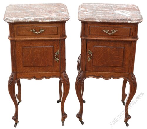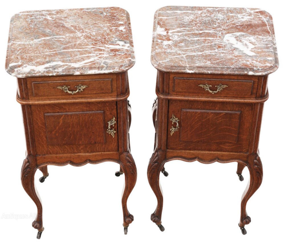 This is a wonderful opportunity to acquire a rare antique pair of oak marble-top bedside tables, offering early 20th-century elegance, solid craftsmanship, and timeless appeal. Sale up to 30% off marked prices