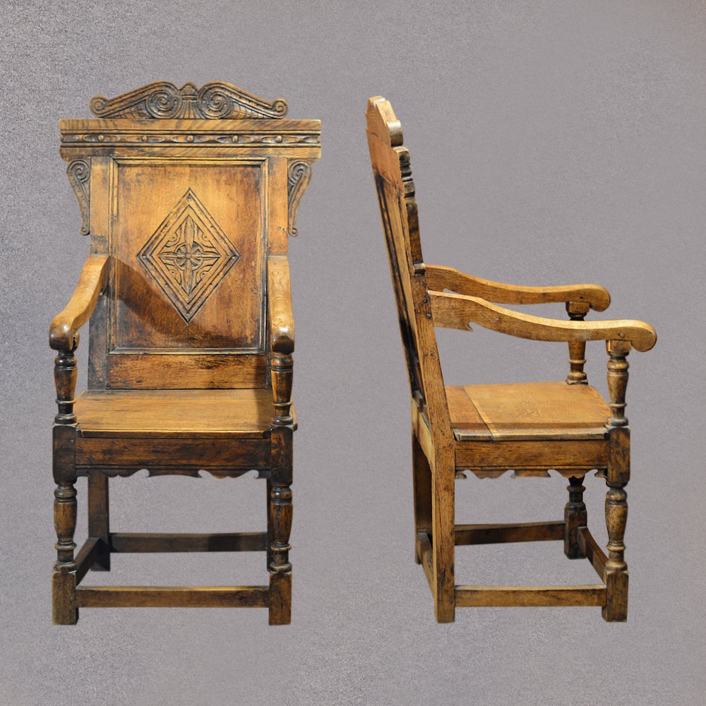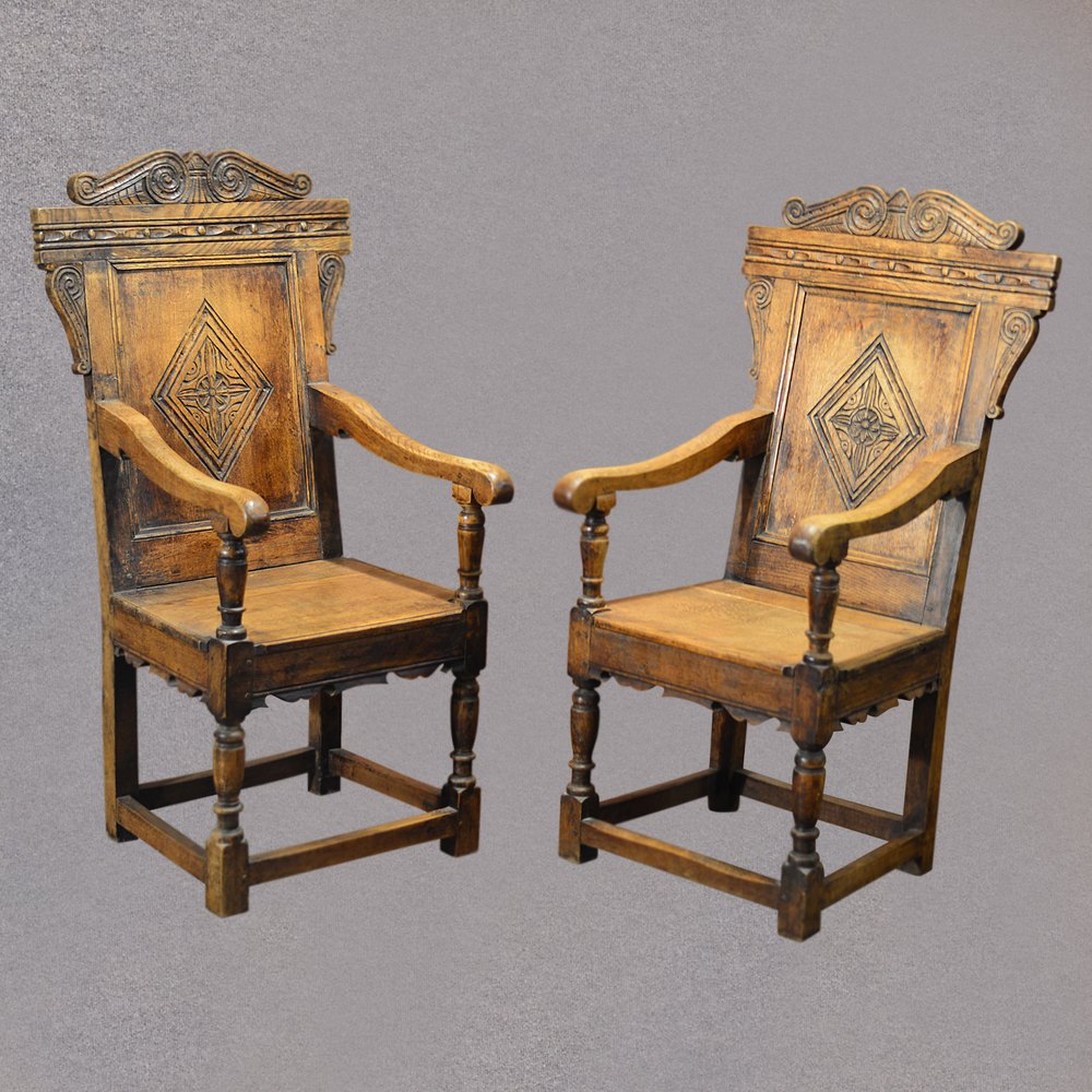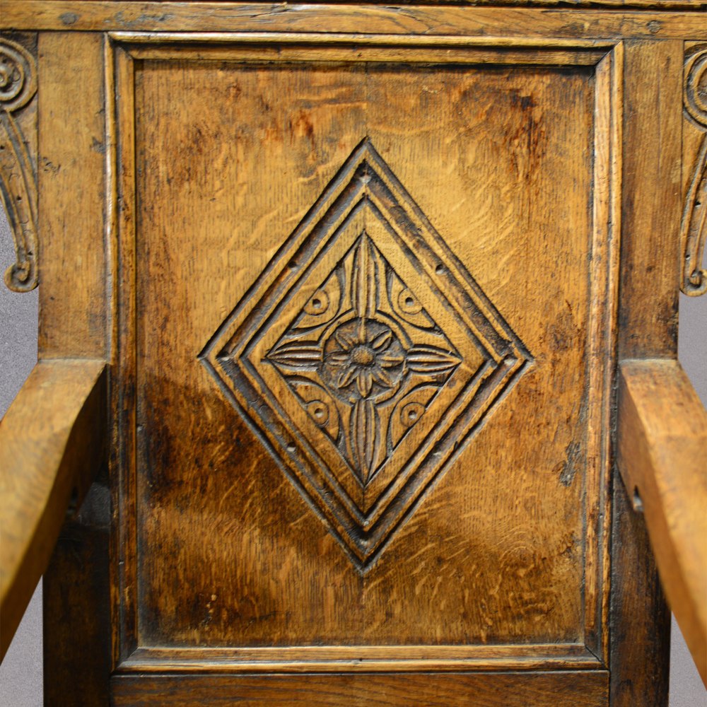 This stunning pair of Victorian, 17th Century revival armchairs are crafted in a wonderful honey coloured English oak. The low level box stretcher unites the legs with generous stock and pegged joints all adding to the solidity. The turning to the front legs continues up into the supports beneath the down swept arms.