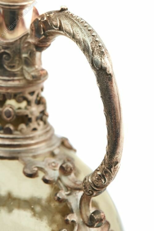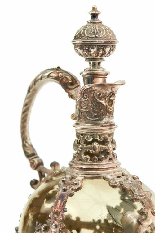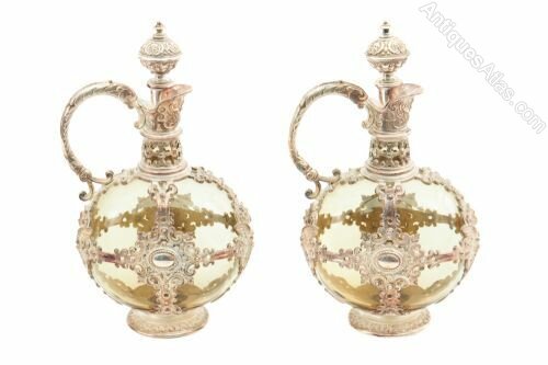 Antique Pair Of Liqueur Ewers, tinted glass and mounted with ornate silver plate decoration. Ornate shaped handles and original stoppers.