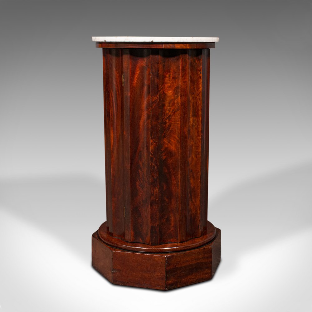 This is an antique pedestal cabinet. An English, flame mahogany and marble nightstand cupboard, dating to the early Victorian period, circa 1850.