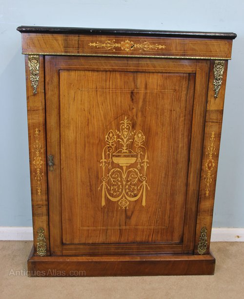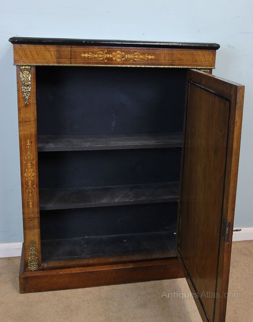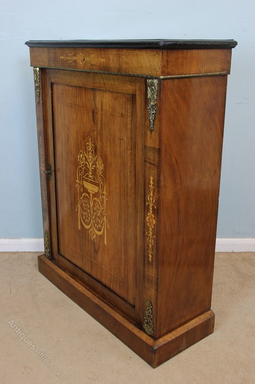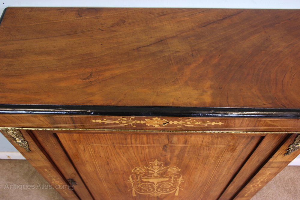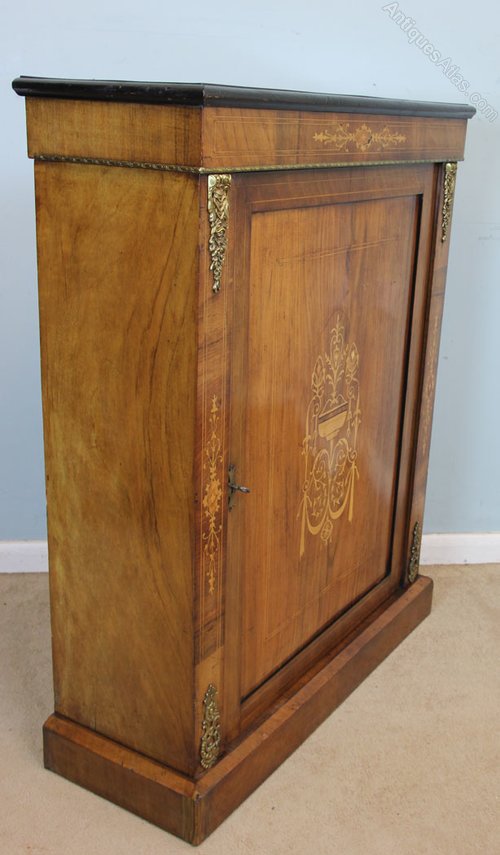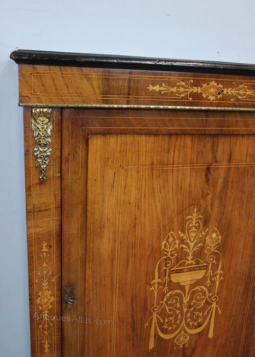 Victorian walnut pier cabinet having inlaid and line decoration, the centre door having lovely inlay decoration, and either side being inlaid and having ormolu mounts, standing on a solid plinth base, the interior having two shelves. Circa 1880