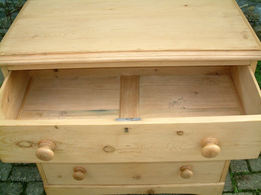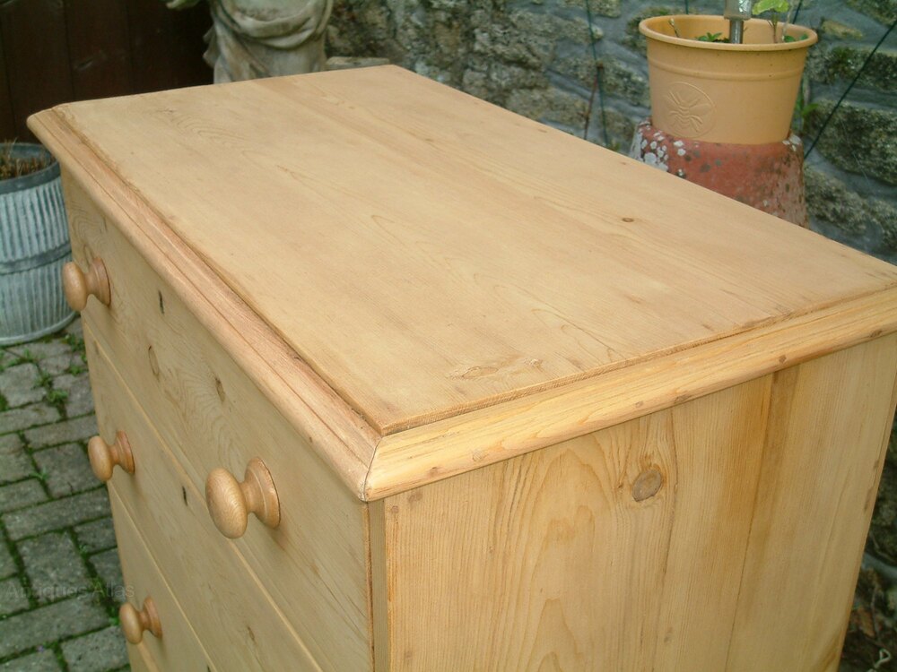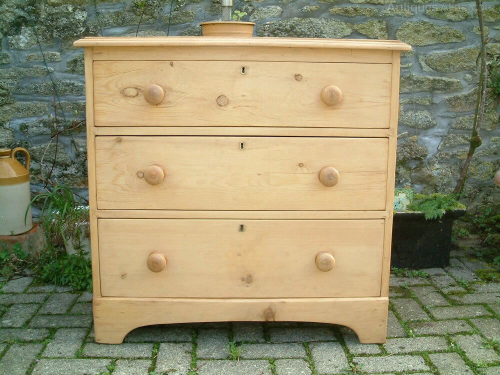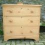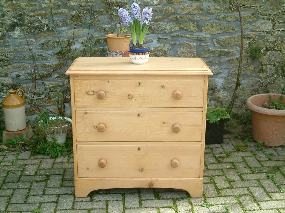A fine, restored Victorian 3 drawer chest, on shaped sides and shaped front plinth. Drawer runners and bearers restored, so drawers glide easily in their recesses. Drawers with all round dovetail construction and timber bases. Original knobs and escutcheons. Wax finish. Fine panelled back. An excellent old pine chest.