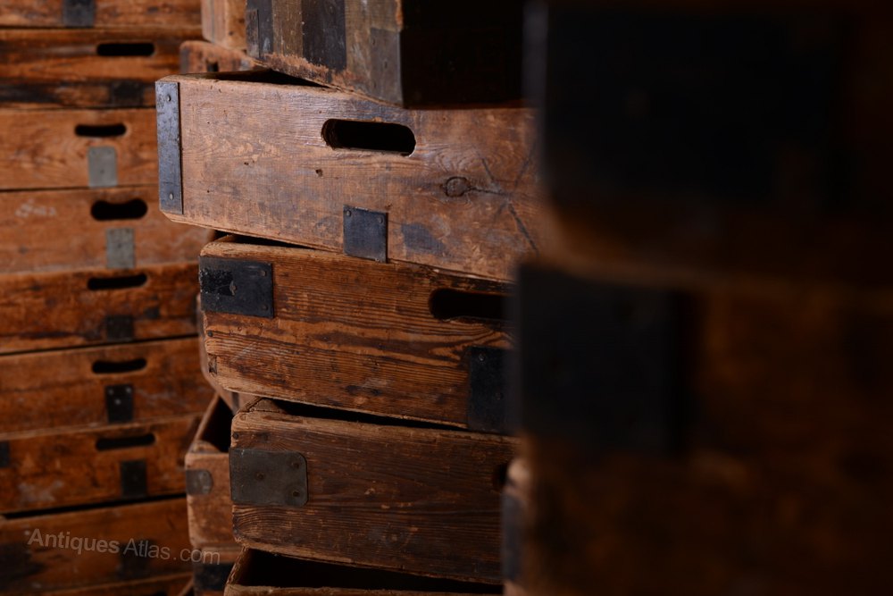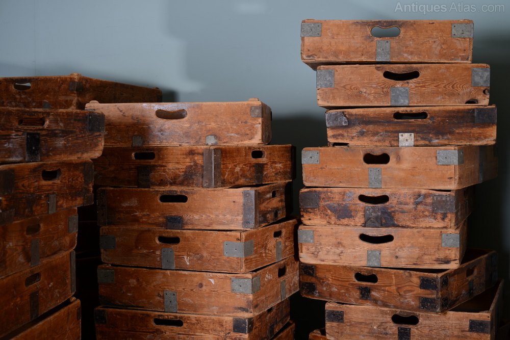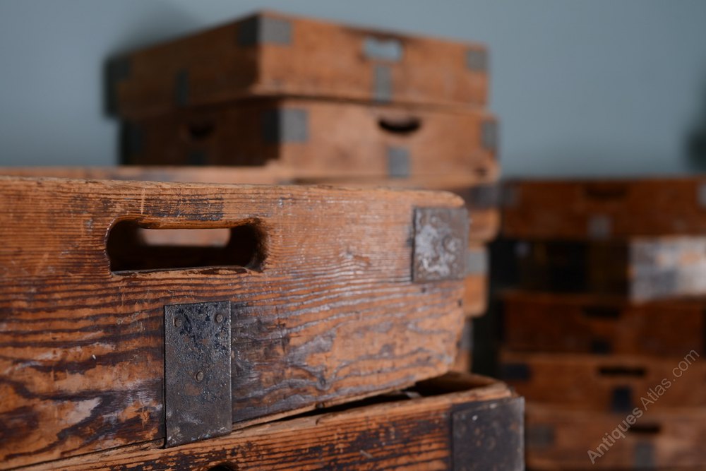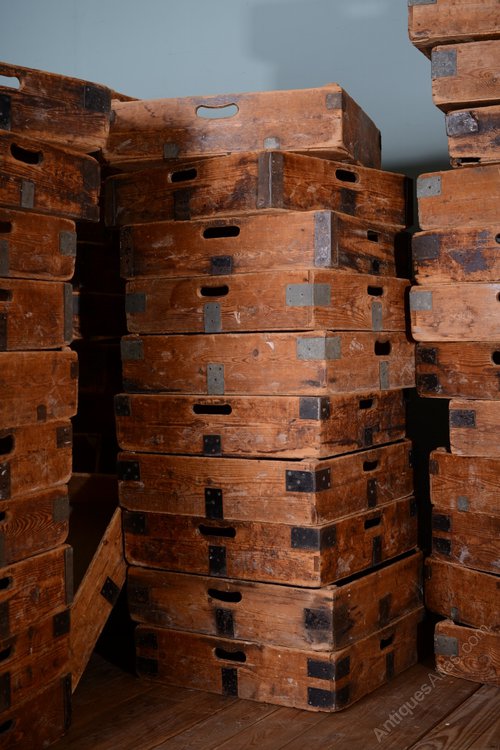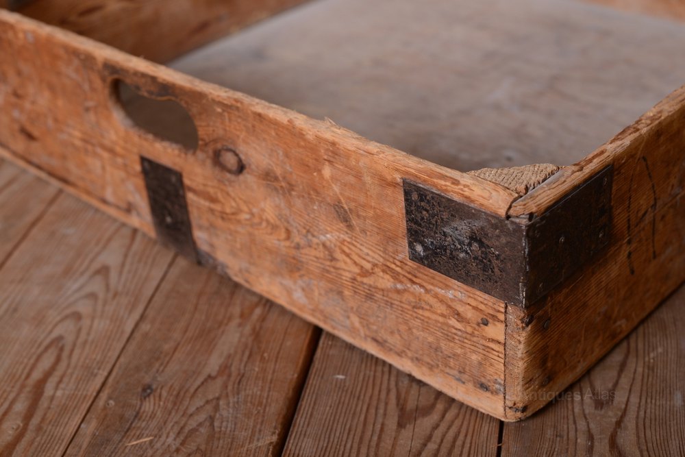We have a large quantity of these English, Edwardian antique pine trays, all are metal bound and with lovely hand cut carrying handles.