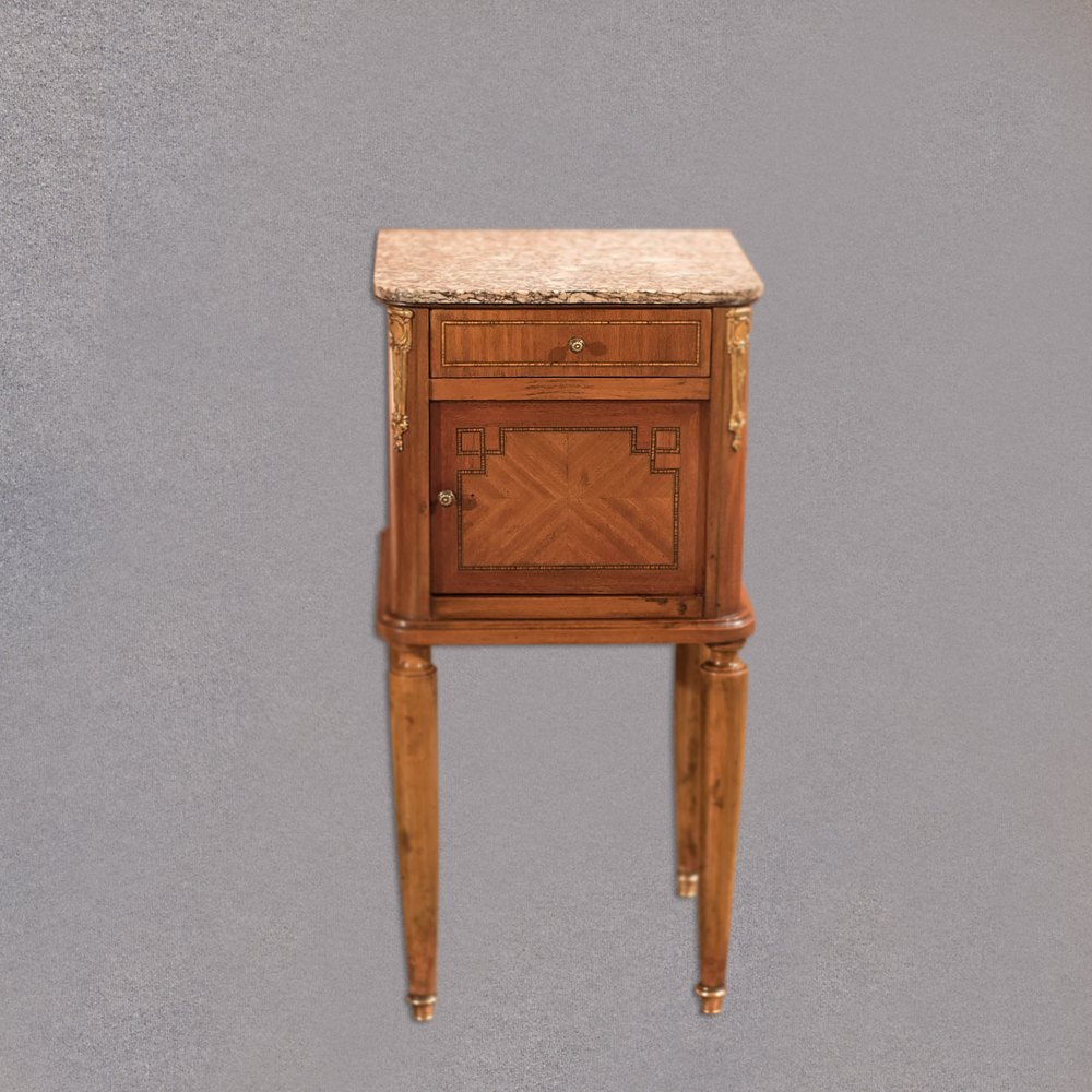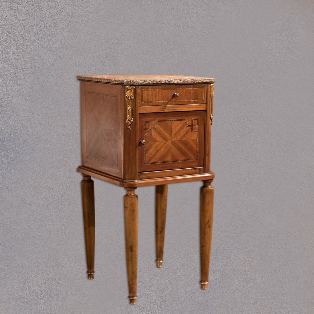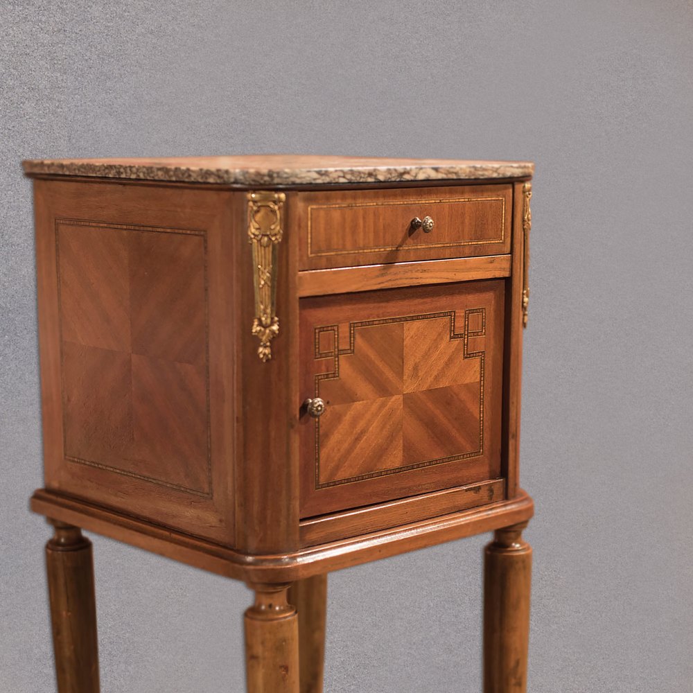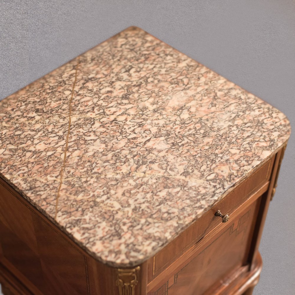 Pair of Antique Satin Birch Marble Top Bedsides