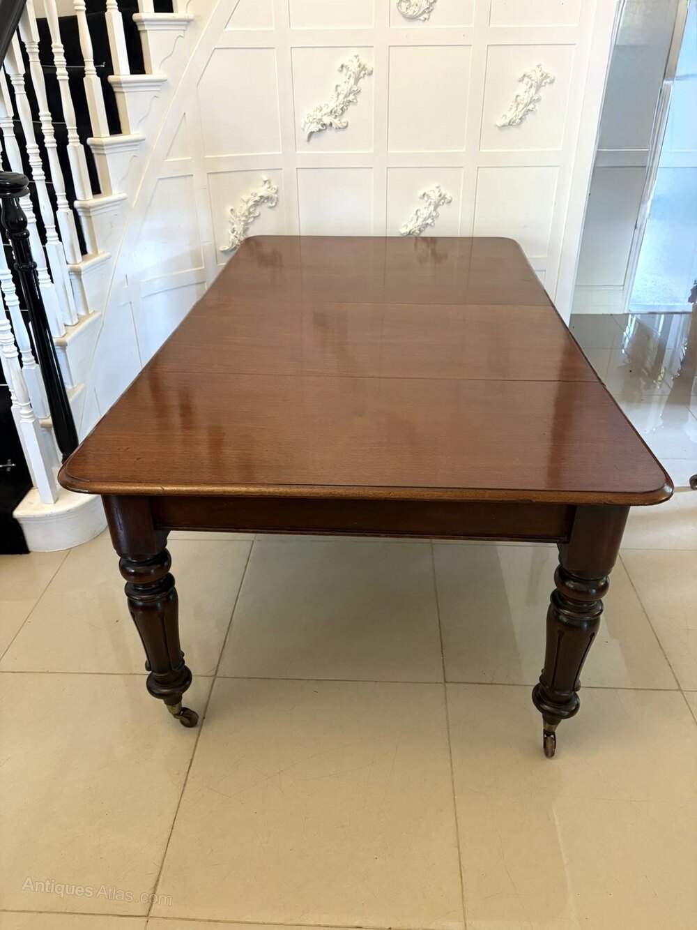 Antique Victorian quality mahogany 10 seater extending dining table having a quality mahogany top with a moulded edge and 2 original extra leaves, pull out extending mechanism standing on 4 shaped tapering tulip legs with original brass cup castors.