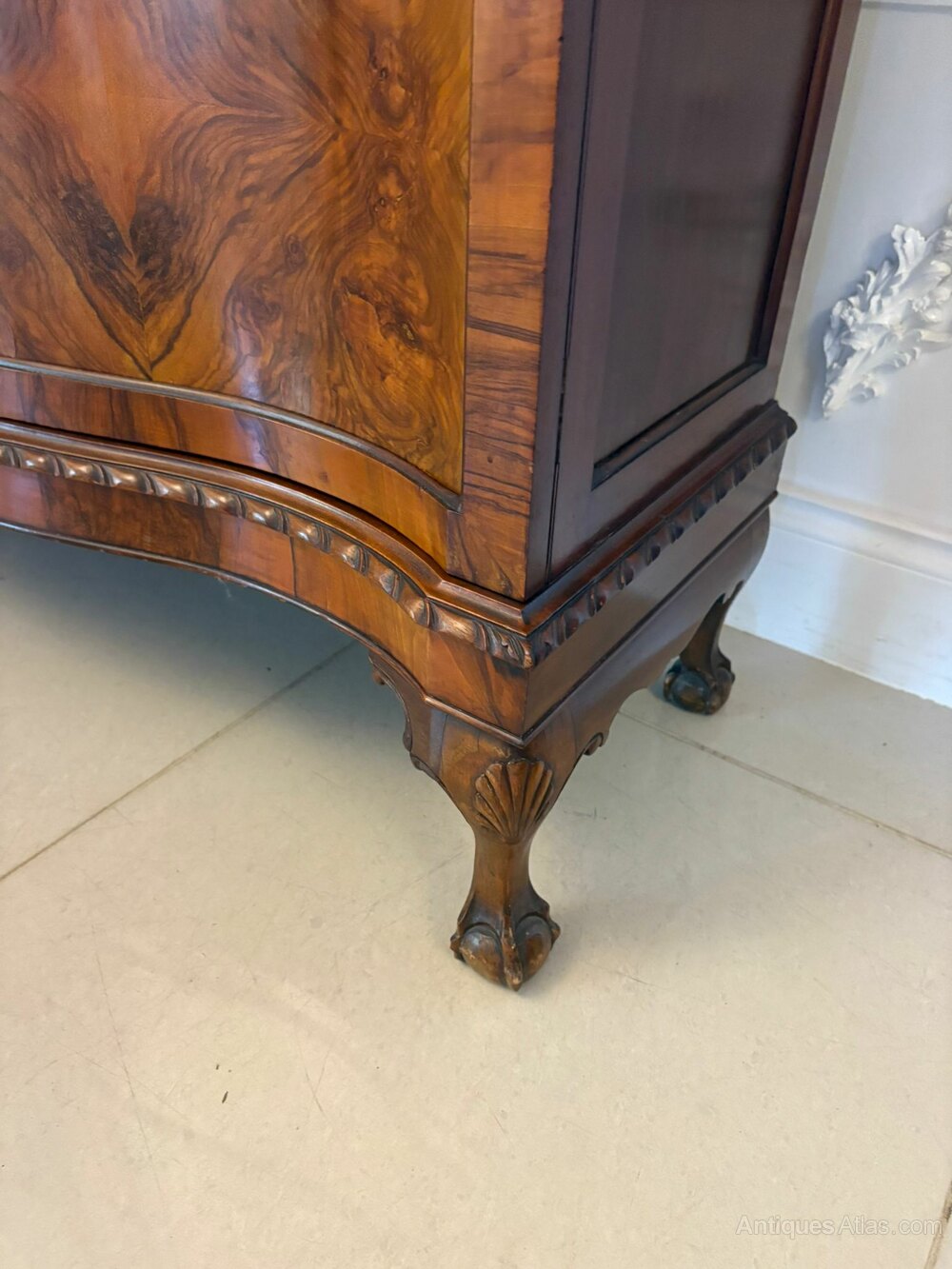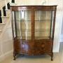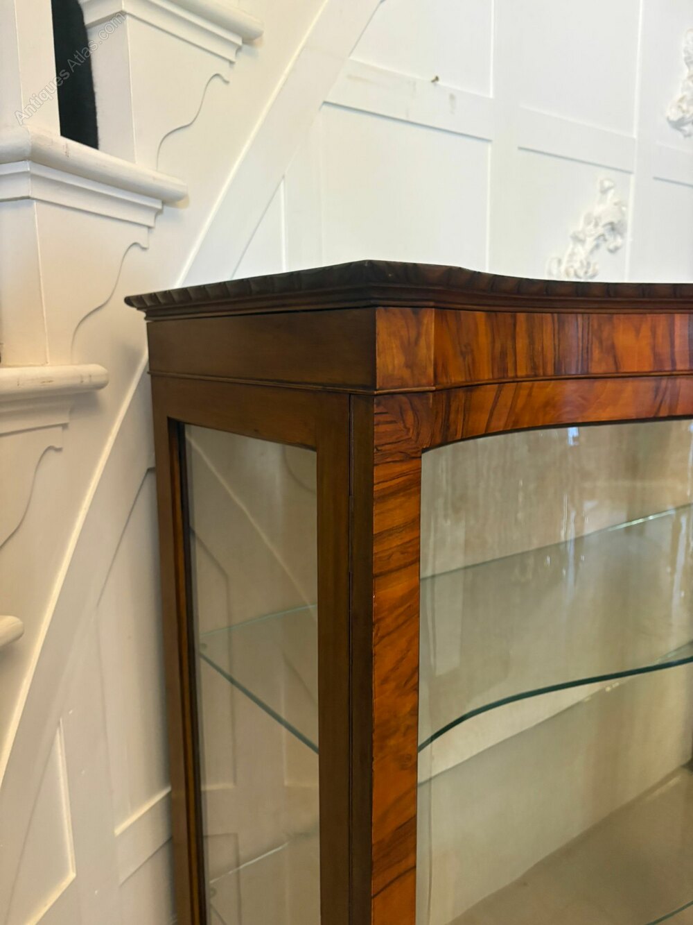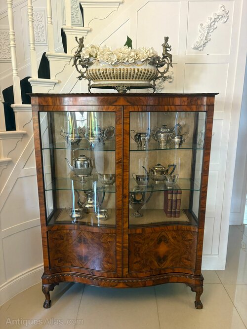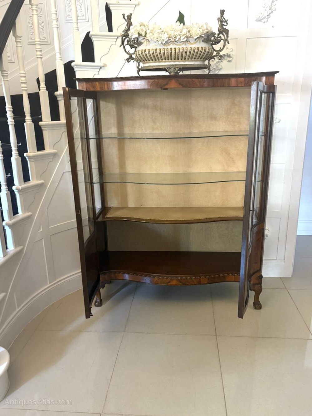 Antique Edwardian quality burr walnut display cabinet having a pair of burr walnut serpentine shaped glazed doors opening to reveal 2 glass display shelves and storage compartment, carved walnut apron standing on shaped carved cabriole legs with claw and ball feet.