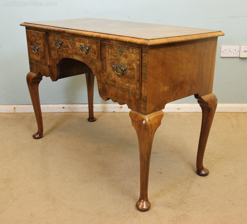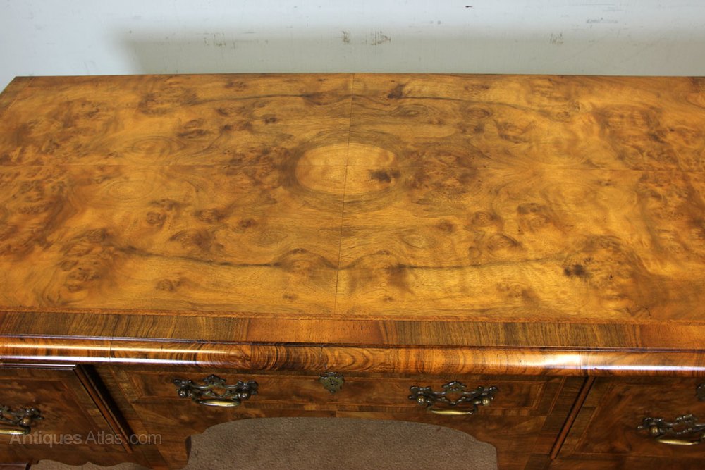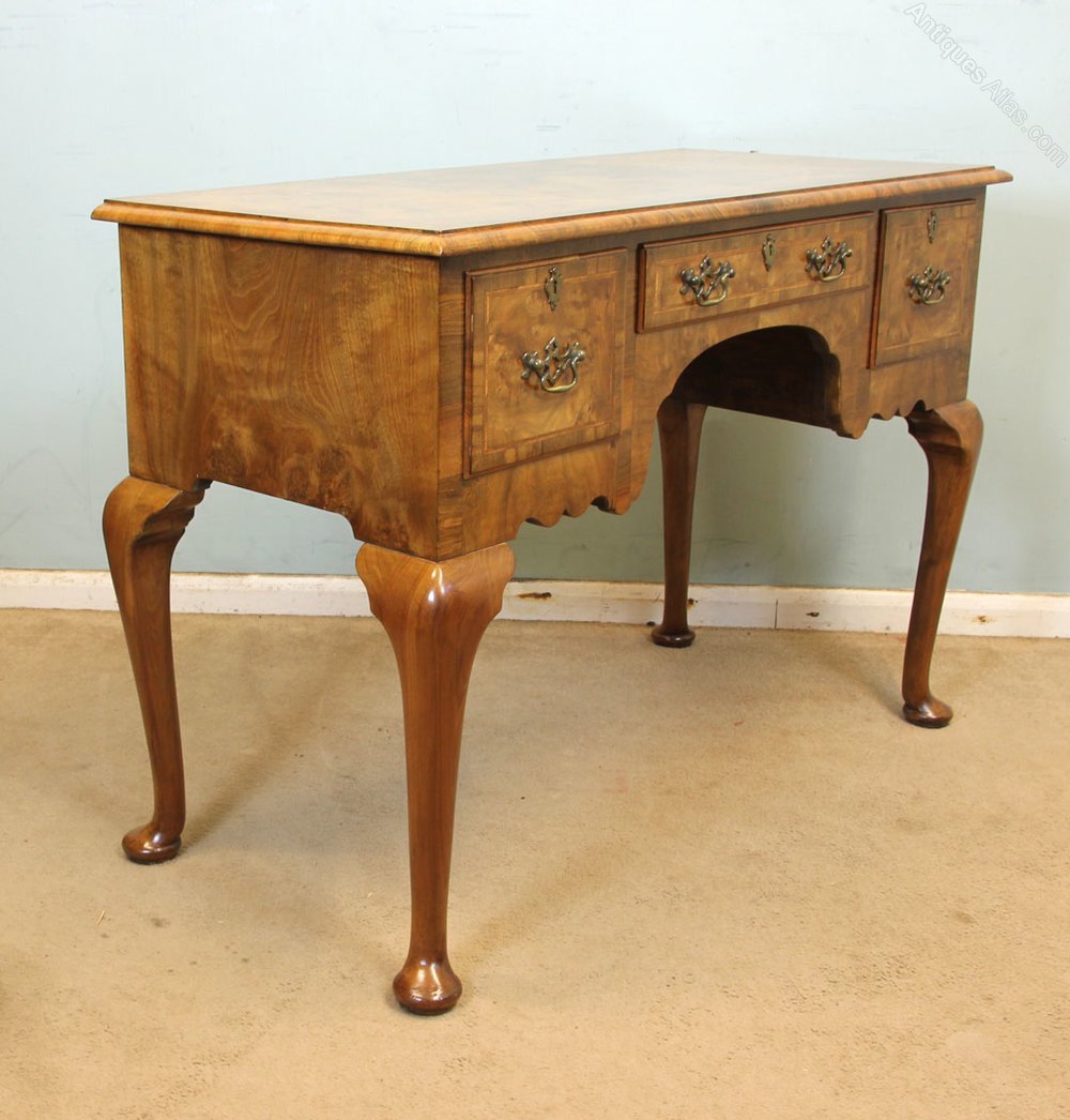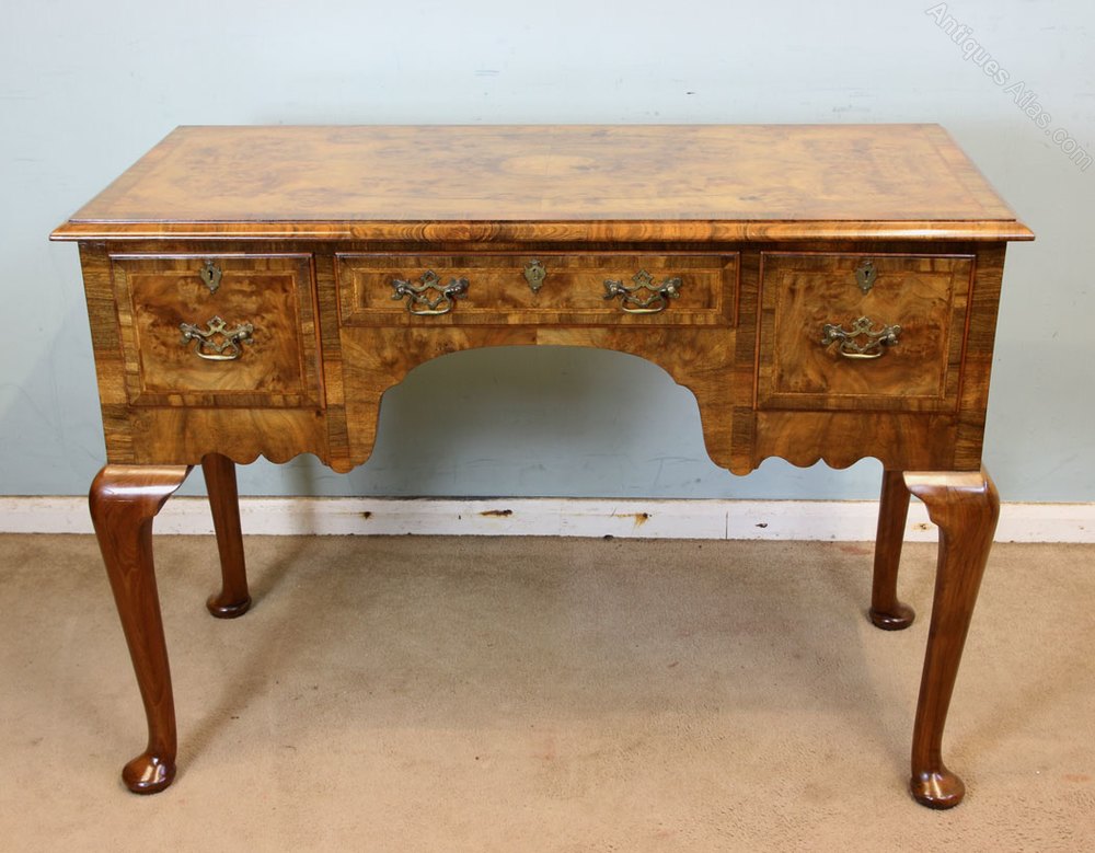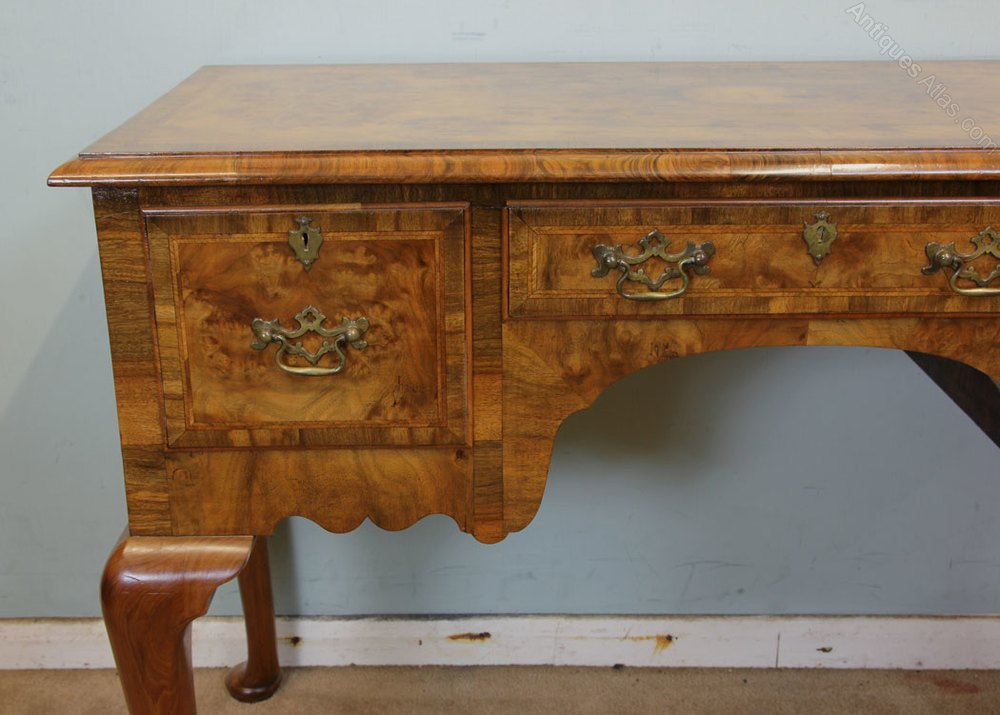 Antique Quality Burr Walnut Side Table. This wonderful quality burr walnut side table has a lovely figured walnut top with a cross banded edge with inlay. Having centre drawer with shaped opening under flanked either side by deep drawer and scrolled edge under all having wonderful figured walnut drawer fronts and crossbanded edge and inlay. All the drawers have oak drawer linings and lovely fine cut dove tails. All supported by cabriole style legs.