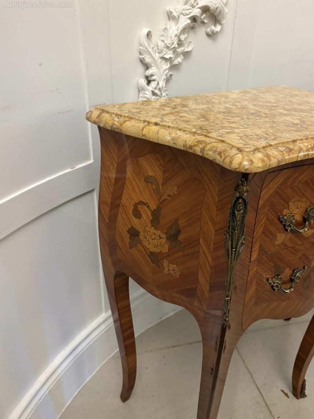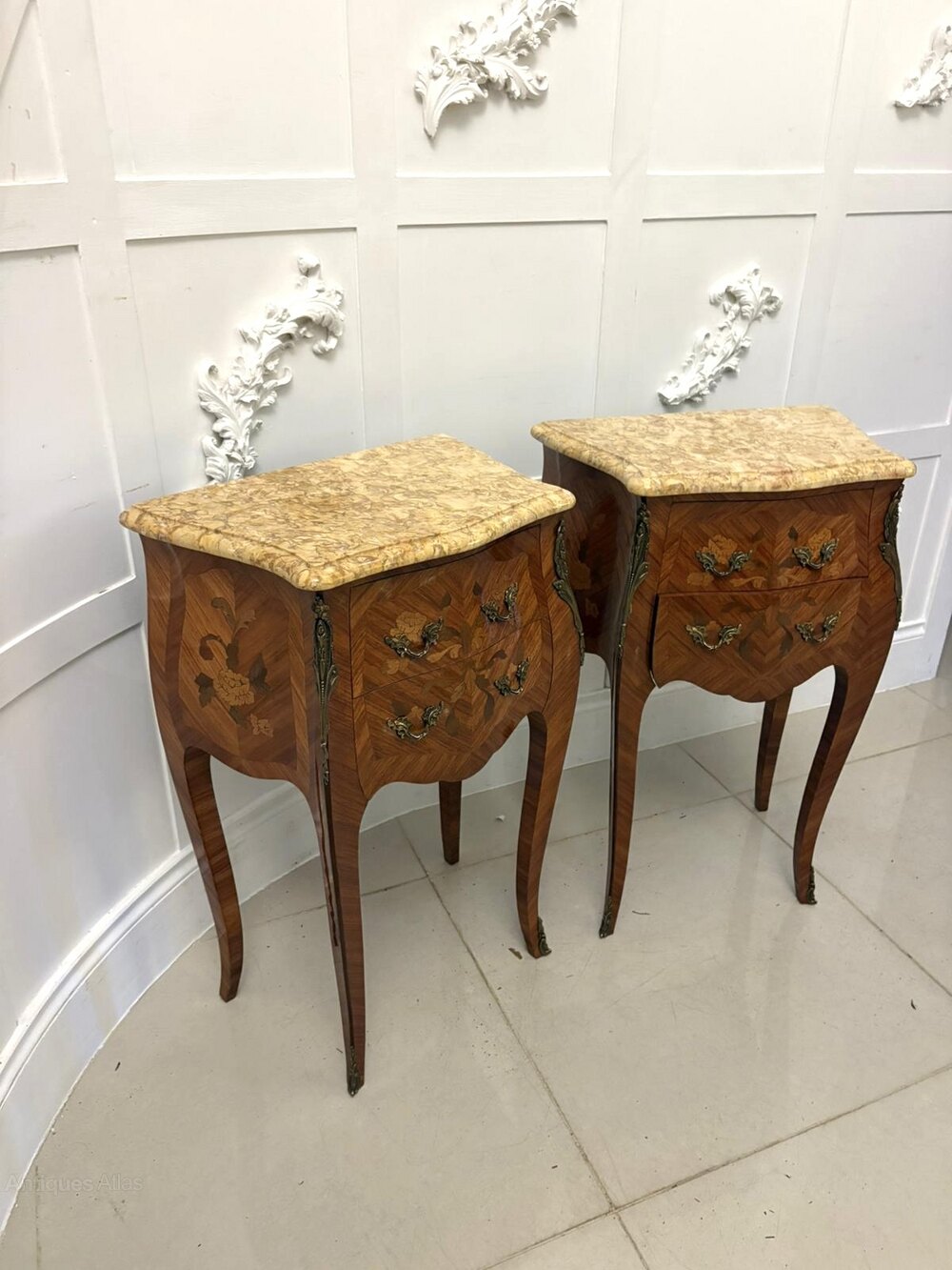 The serpentine-shaped tops are finished in richly coloured breccia marble perfectly complementing the warm tones of the veneers below. Each cabinet features two drawers with finely detailed floral marquetry, elegant brass handles, and decorative ormolu mounts to the sides, knees, and feet. The subtle chevron-pattern veneer work across the fronts and sides demonstrates superb artistry and precision, typical of fine Parisian craftsmanship in the late 19th century.