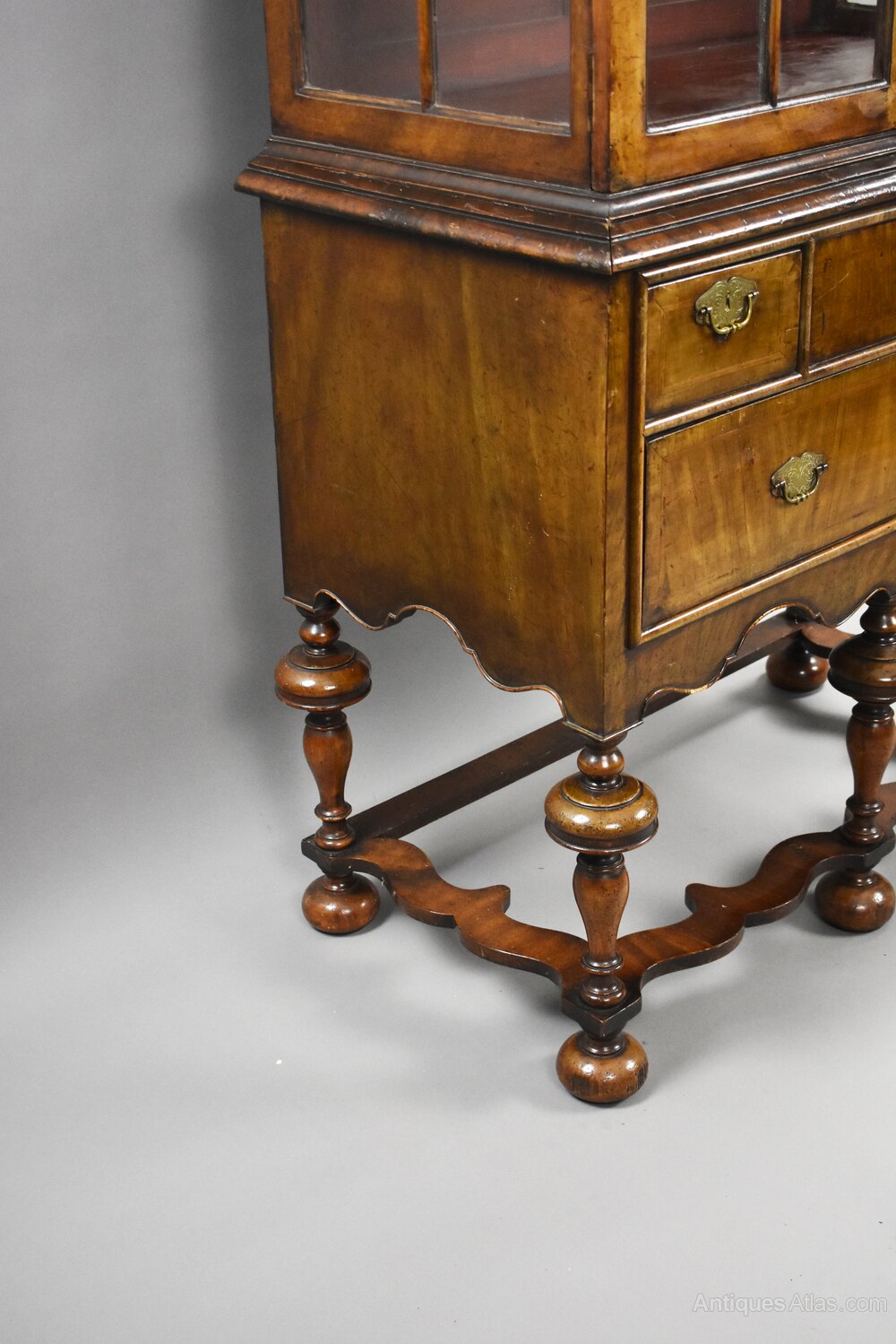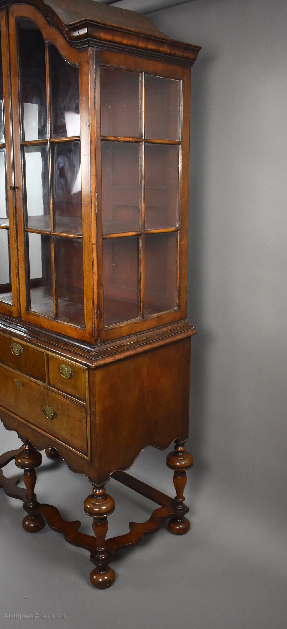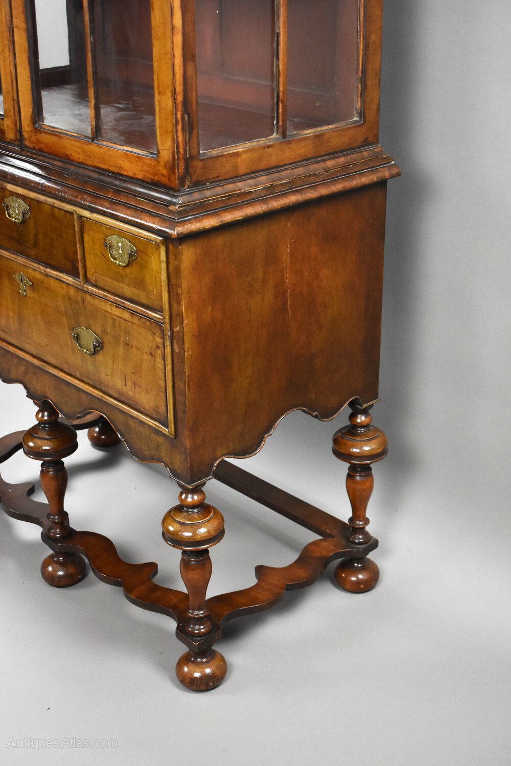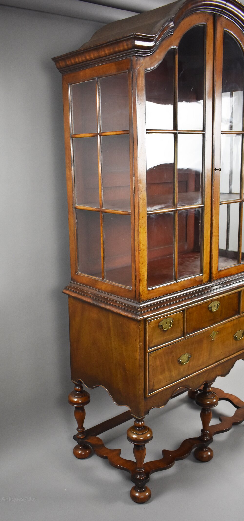 A fine Queen Anne style walnut cabinet on stand, circa 1900, of elegant proportions and rich colour. The upper section features an arched cornice above a pair of astragal-glazed doors opening to a shelved interior, ideal for displaying treasured items. Below, the base is fitted with an arrangement of three short drawers above a long drawer, all retaining their brass plate handles and escutcheons. The whole is raised on well-turned baluster legs united by shaped stretchers, terminating in bun feet.
