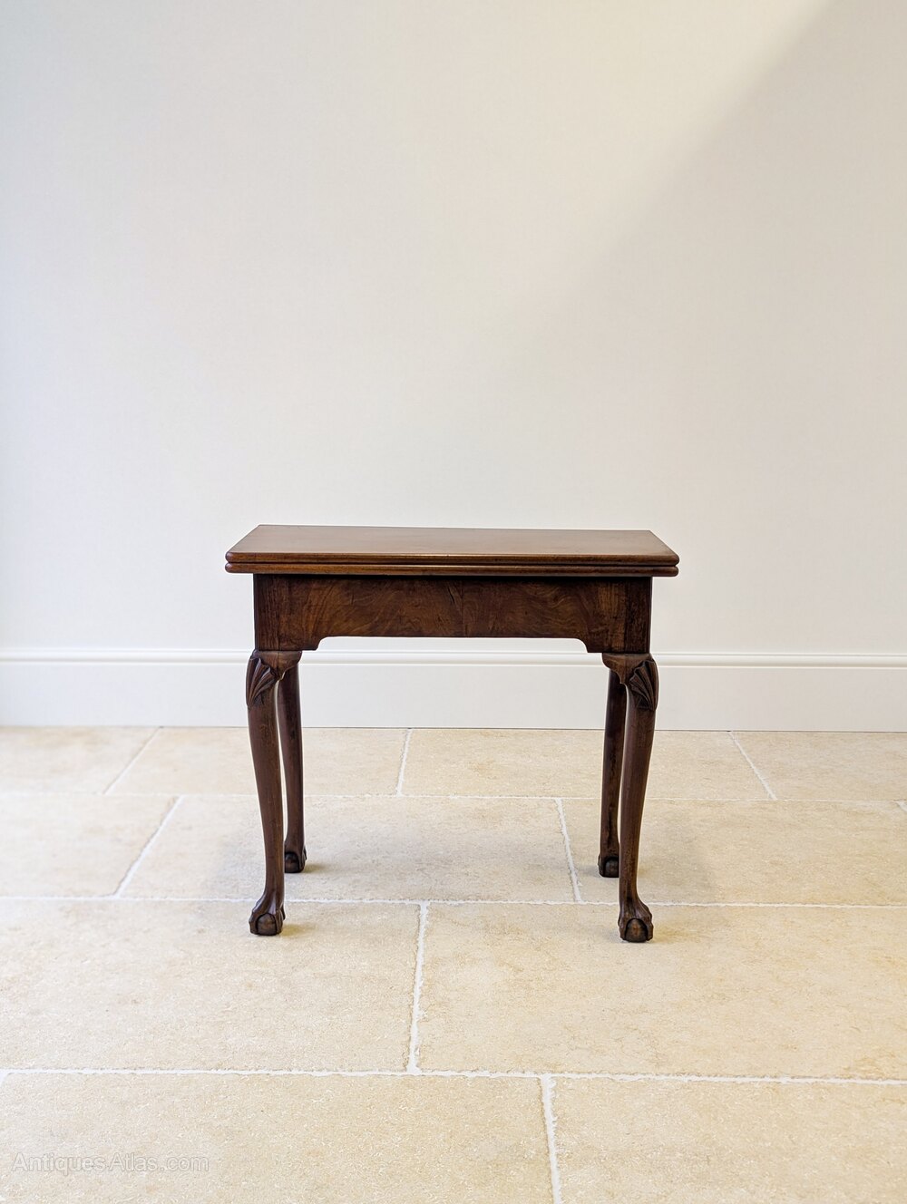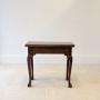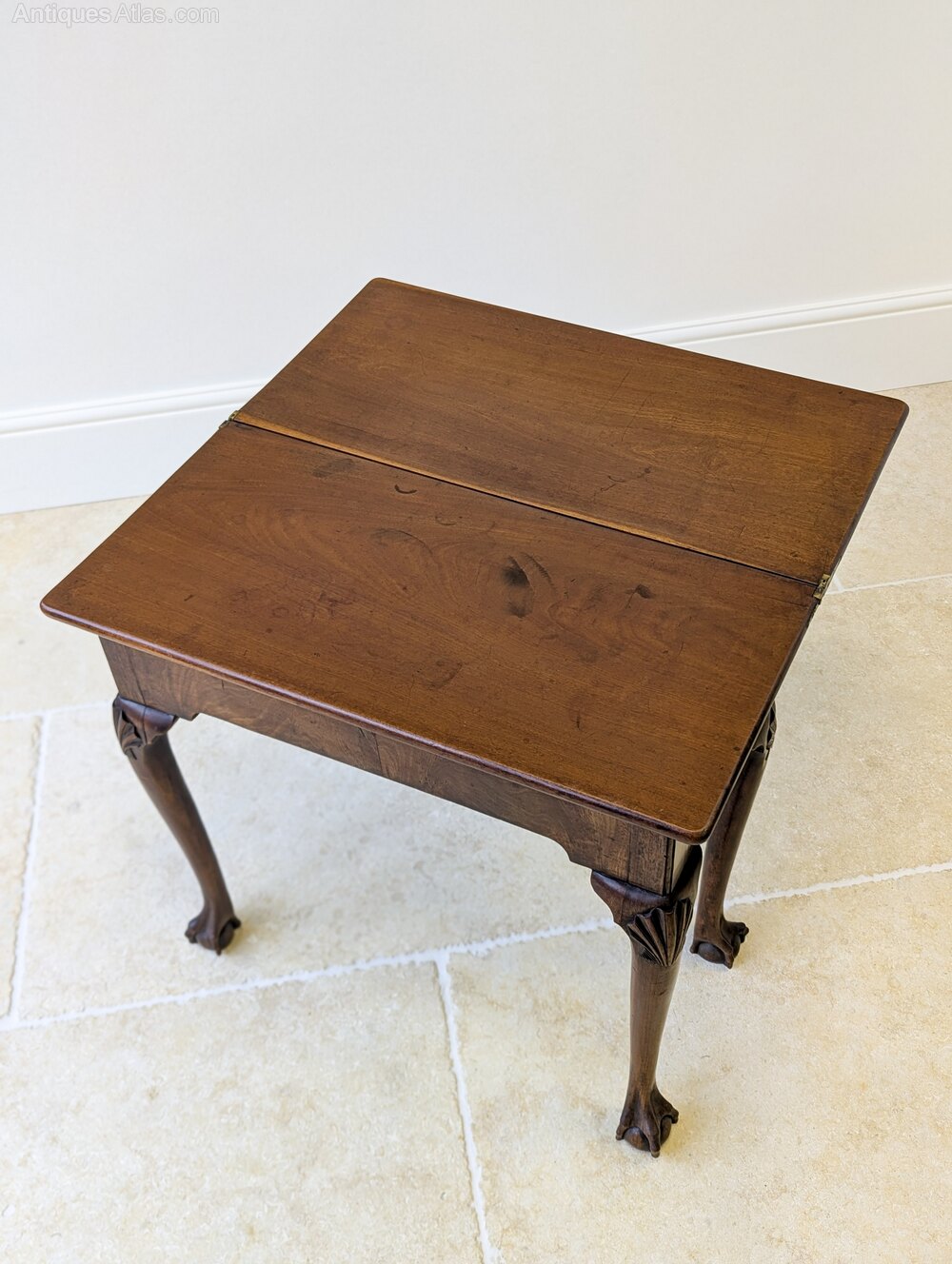 A fine Regency mahogany fold-over tea table of compact proportions and raised on exceptional shell-carved cabriole legs with ball and claw feet. The rectangular top folds over to form a generous surface, supported by the original gate-leg action.