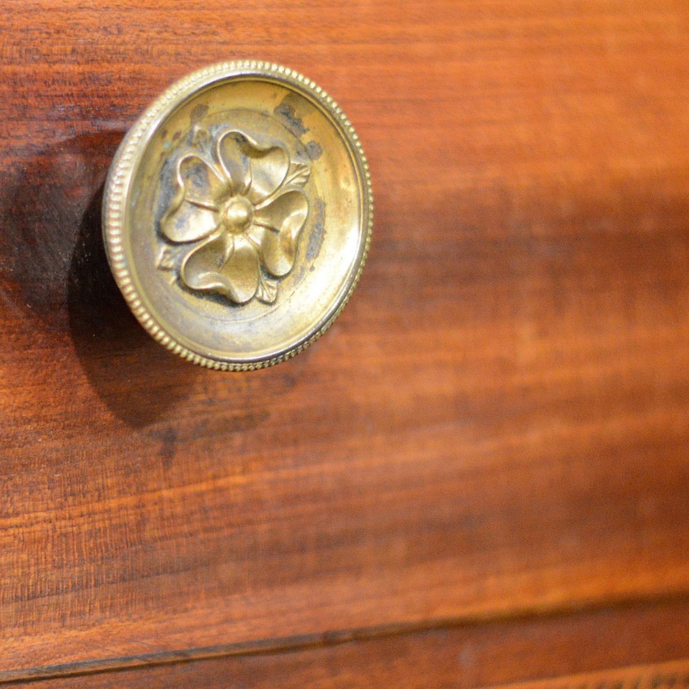 The well figured mahogany throughout has a deep sheen in rich, warm hues. To the front the deep drawer has twin brass rosette pulls and slides smoothly offering generous storage.