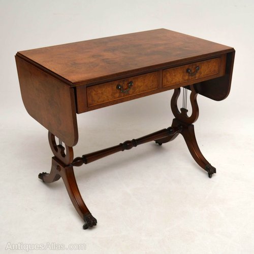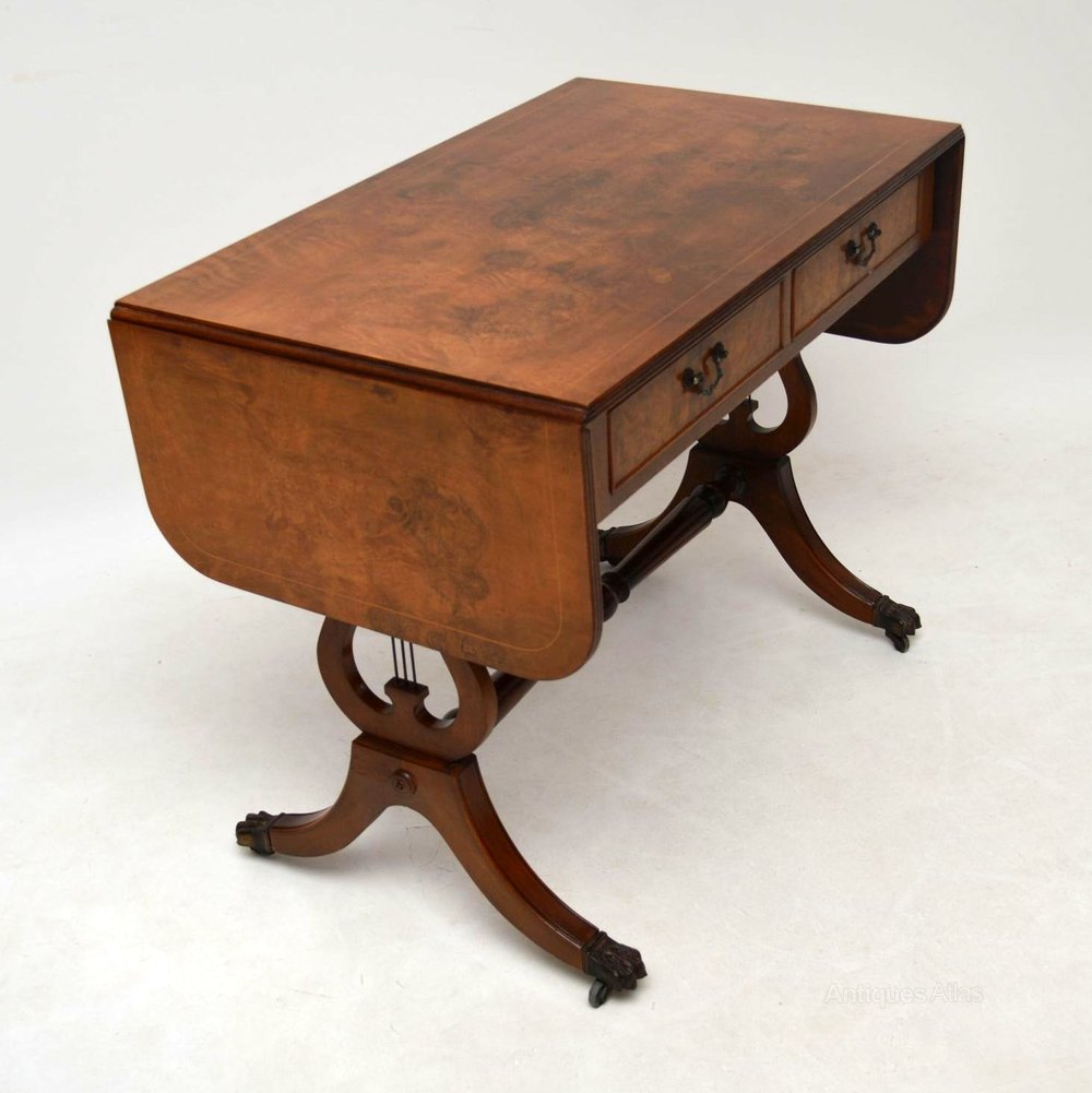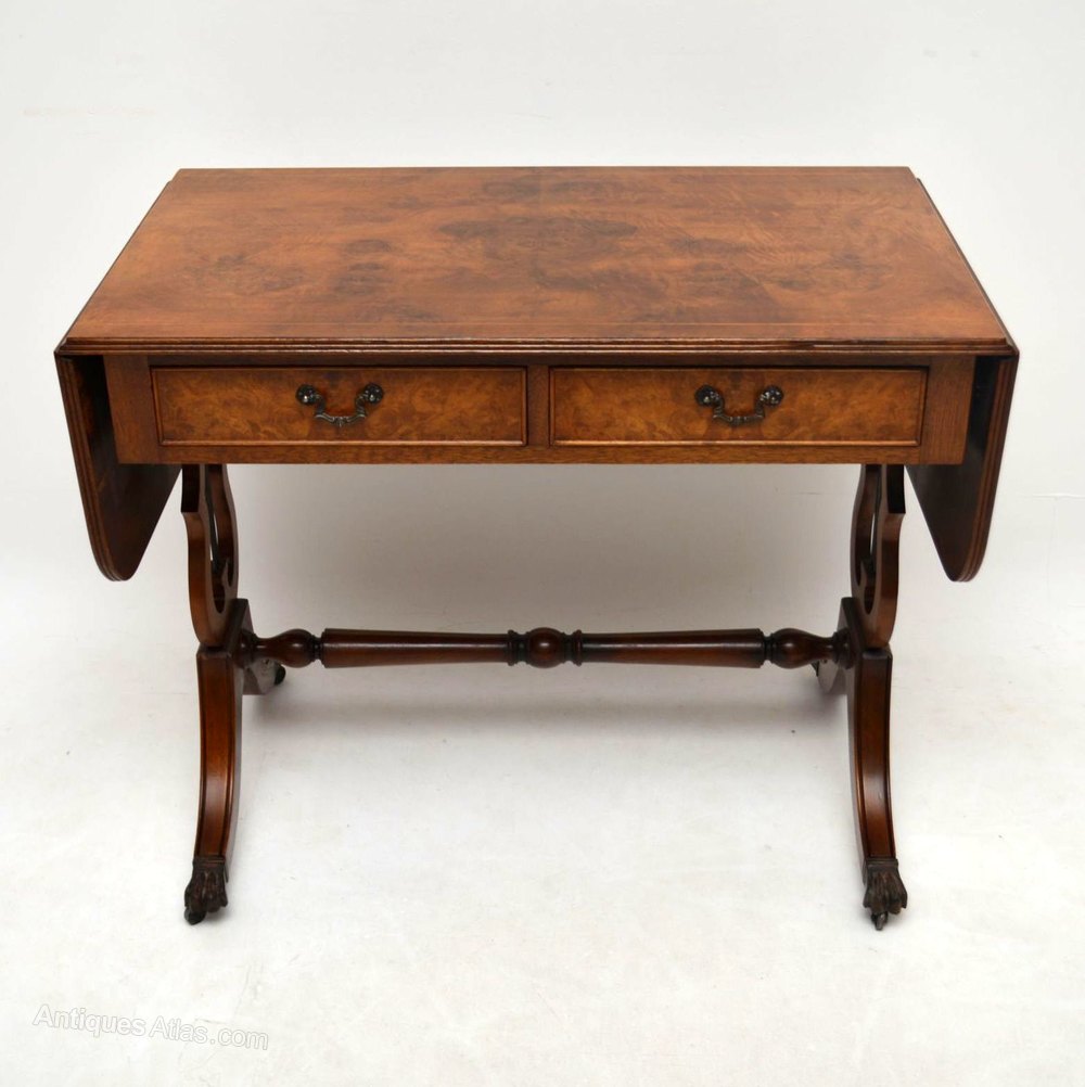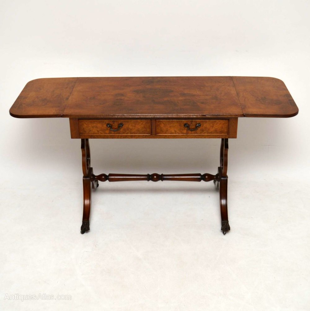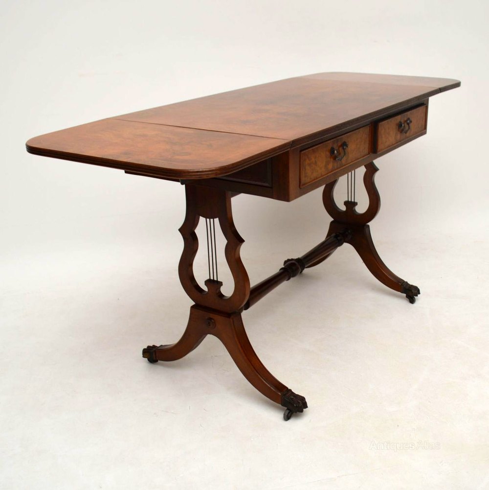 Antique Regency style burr walnut sofa table, dating from around the 1930-50's period & in good condition. The top is a beautifully patterned burr walnut with an inlaid border near the edge & the drawer fronts are burr walnut too, with original brass handles. The top edge is reeded & it has lyre shaped ends with sabre legs below on brass capped casters. The legs are joined together by a turned cross stretcher with gives it a nice look & also makes it stronger. Originally these sofa antique tables were intended to put behind a sofa, but they are equally useful as side tables or even writing antique tables. This table is finished on the back too, with dummy drawers.