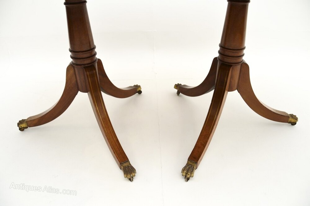 It has a beautiful mahogany top with inlaid brass borders. Each half sits on a pedestal tripod base with brass inlaid legs and brass hairy paw casters. This come with an additional leaf which extends the top from a six seater into an eight seater.