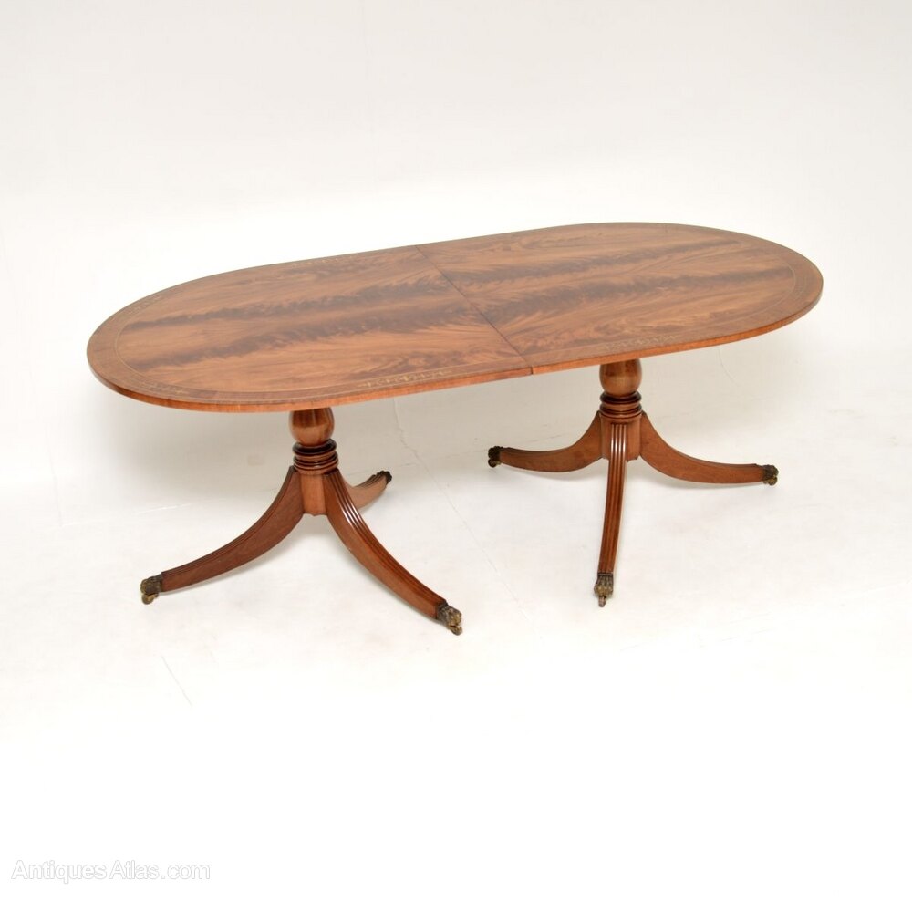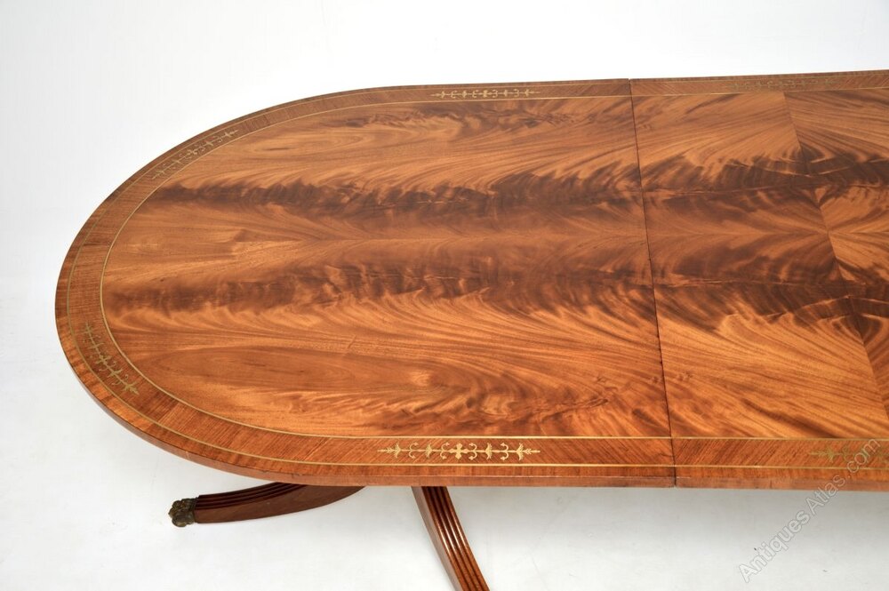 It has a stunning flame mahogany top with inlaid brass borders and cross banded edges. Each half sits on a pedestal tripod base with reeded legs and brass hairy paw casters. This come with two additional leaves which extends the top from a six seater into a very large table that can comfortably seat up to twelve.