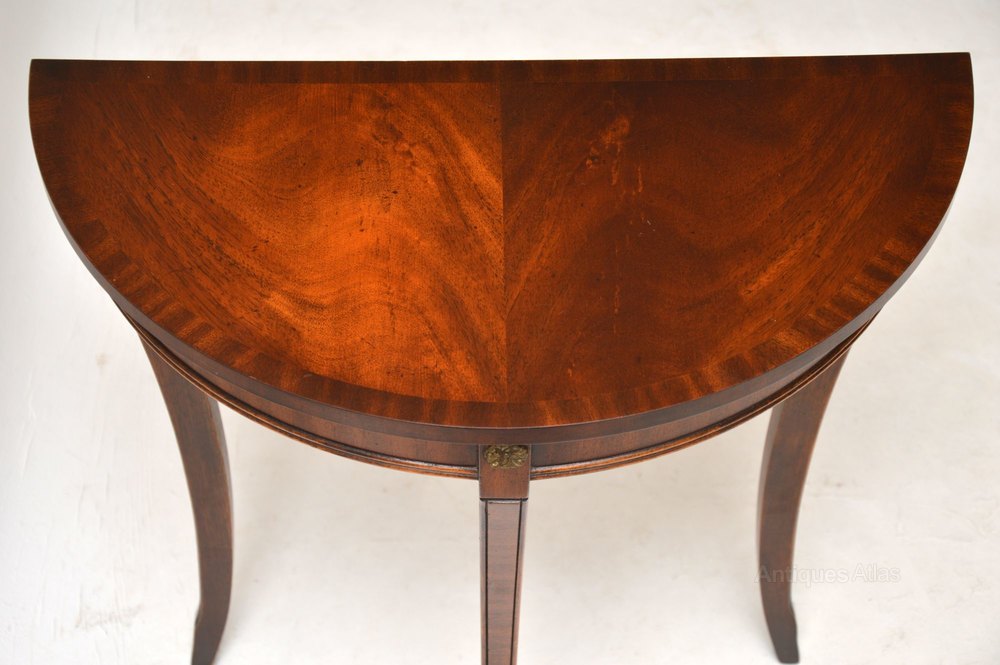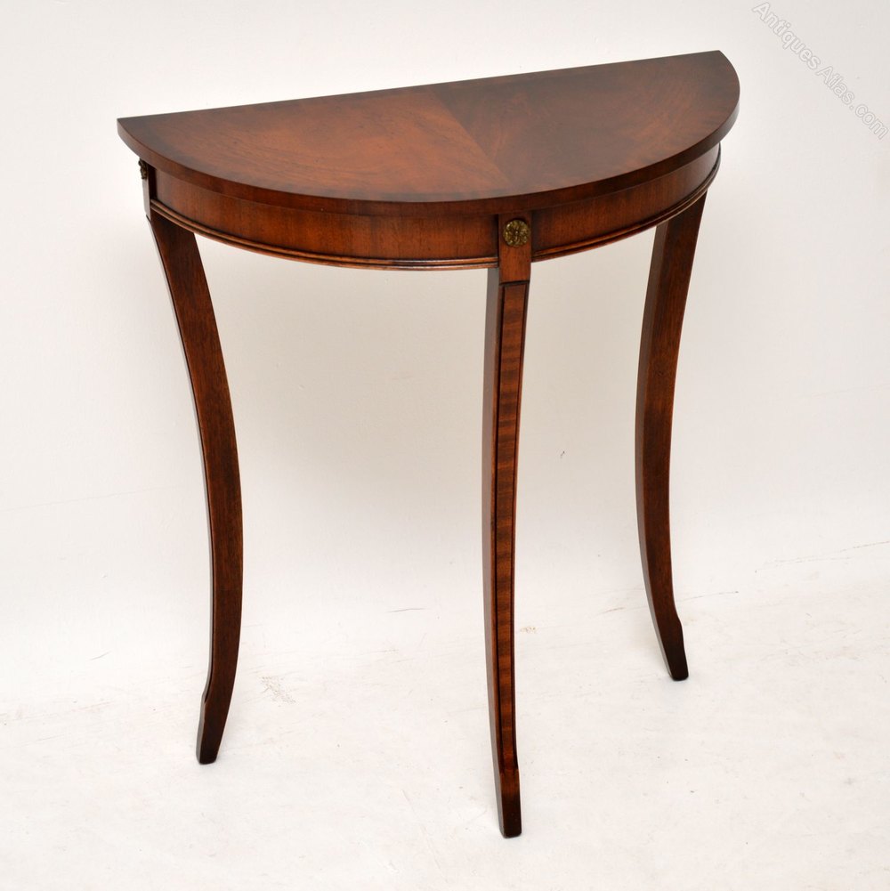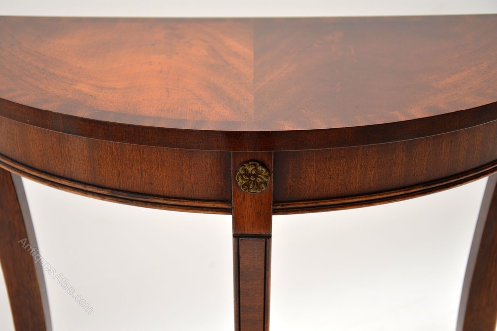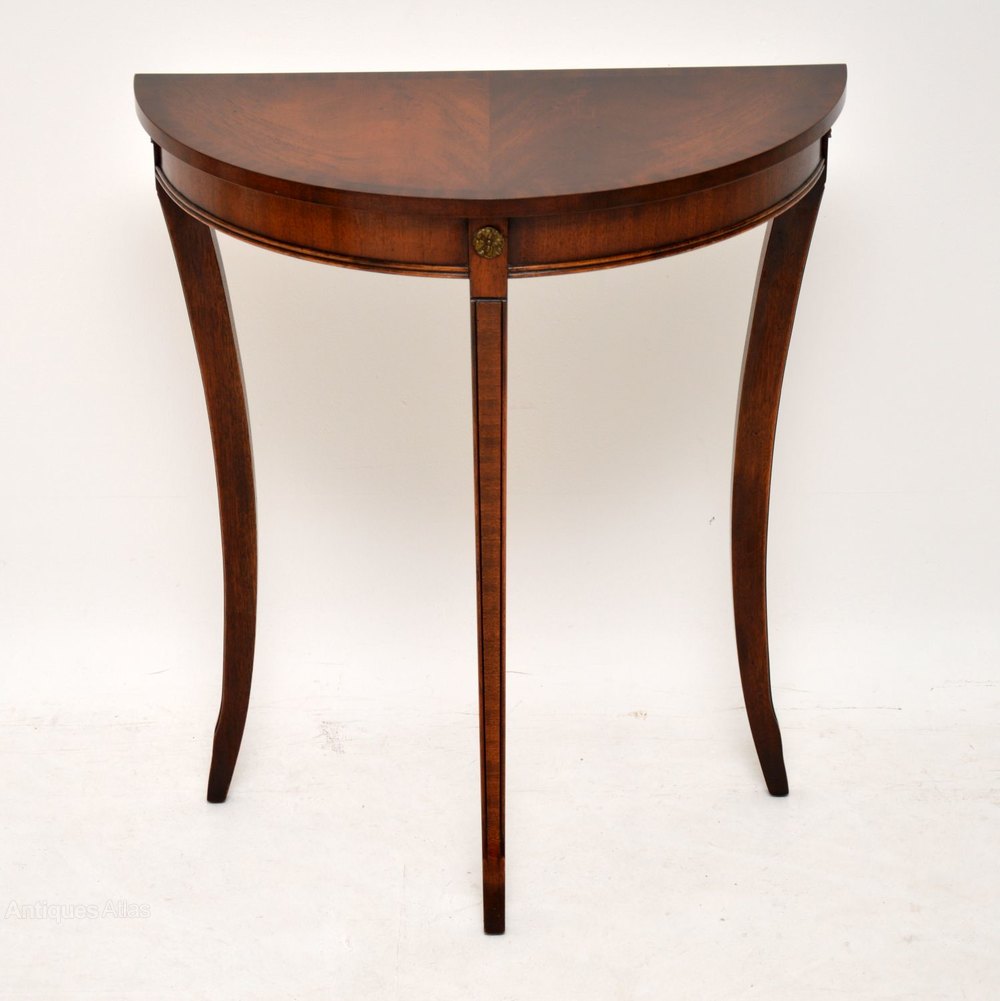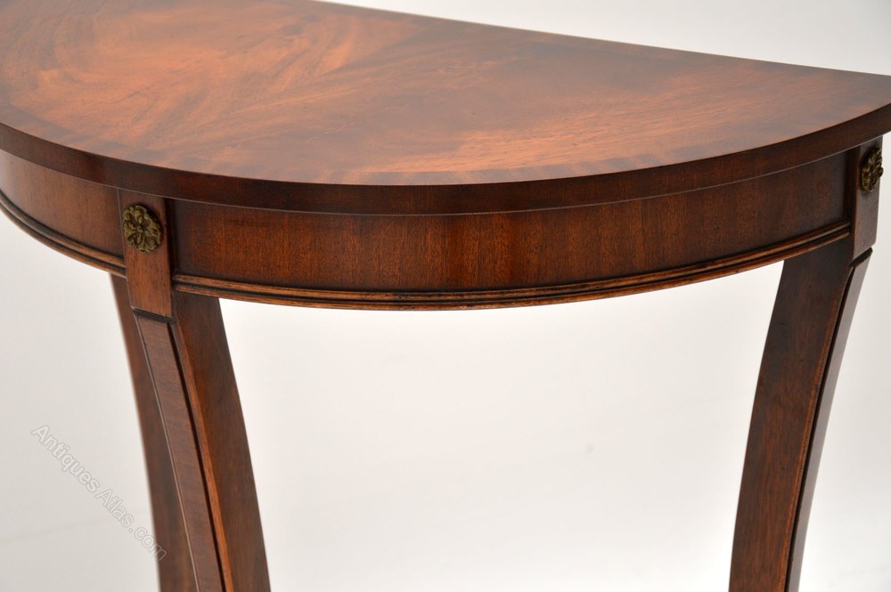 Small antique Regency style mahogany console side table dating from around the 1950’s period & in excellent condition. It has a cross banded flame mahogany top, brass rosettes on the front edges & sabre legs.