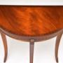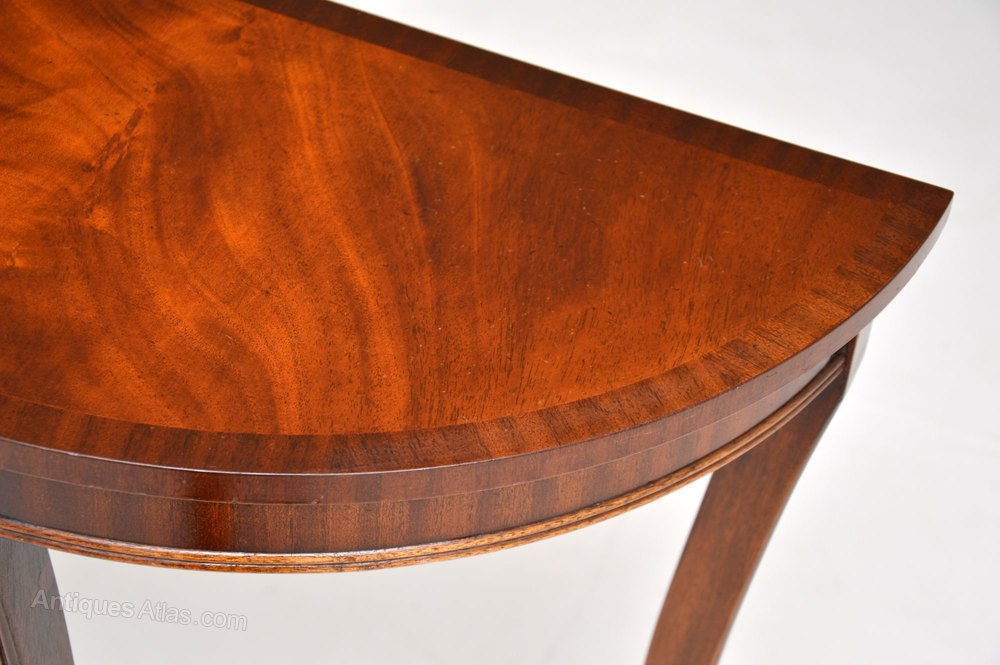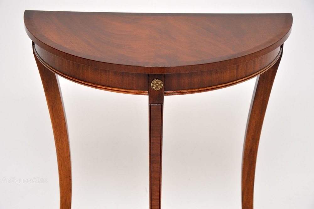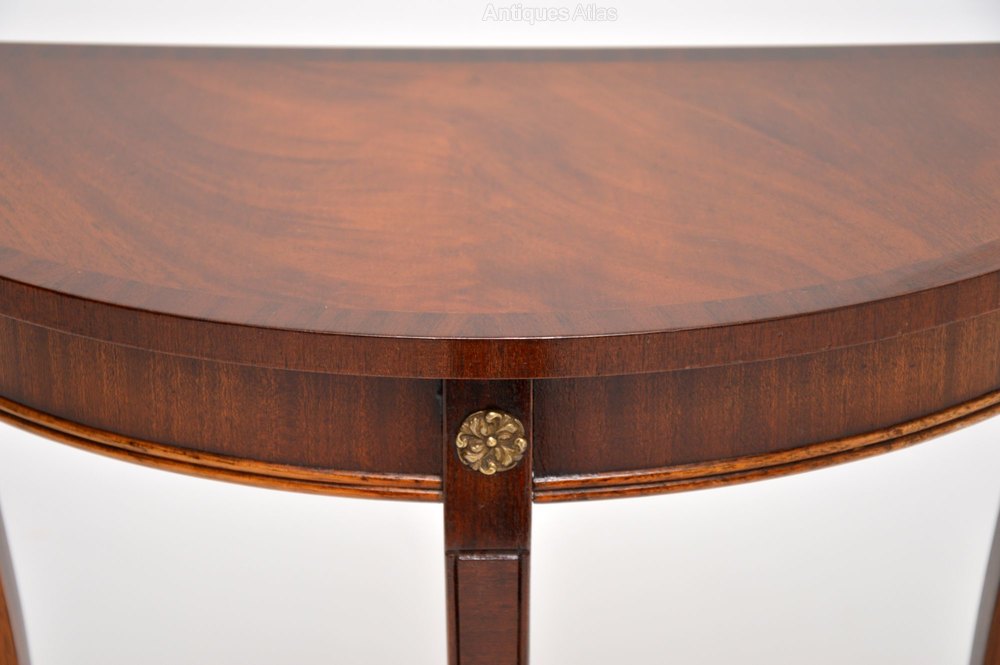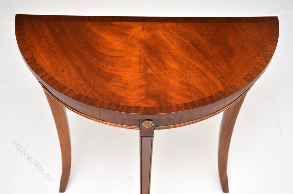 The quality is lovely, this is a very useful and petite size. The three legs have a beautiful sabre shaped design, supporting a demi-lune shaped top. The top is nicely cross banded and has gorgeous flame mahogany grain patterns.