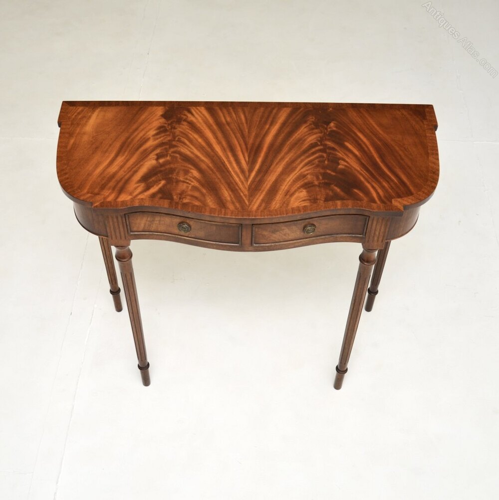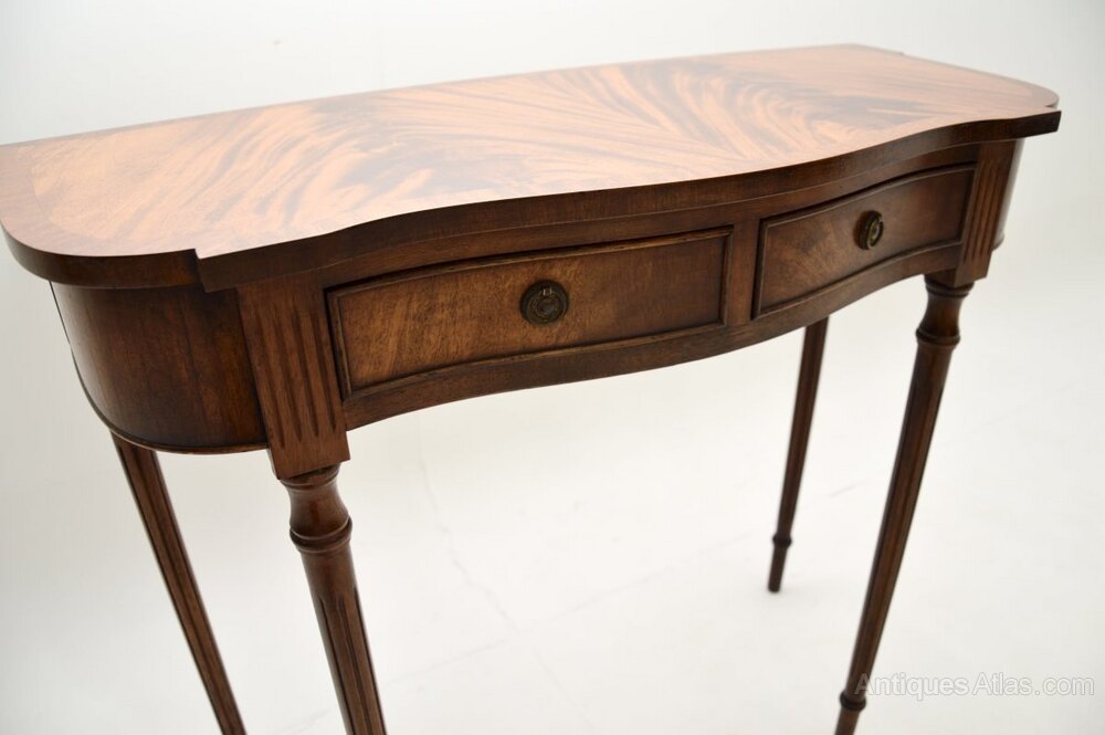 The quality is excellent and this has a lovely, compact and stylish design. The front has a serpentine shape, it sits on beautifully turned and fluted legs. There are two drawers with original brass handles and the top has a cross banded edge.