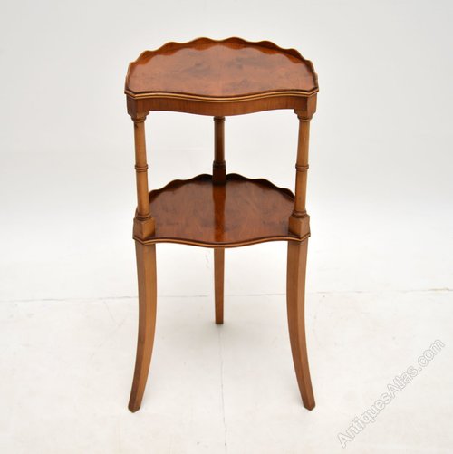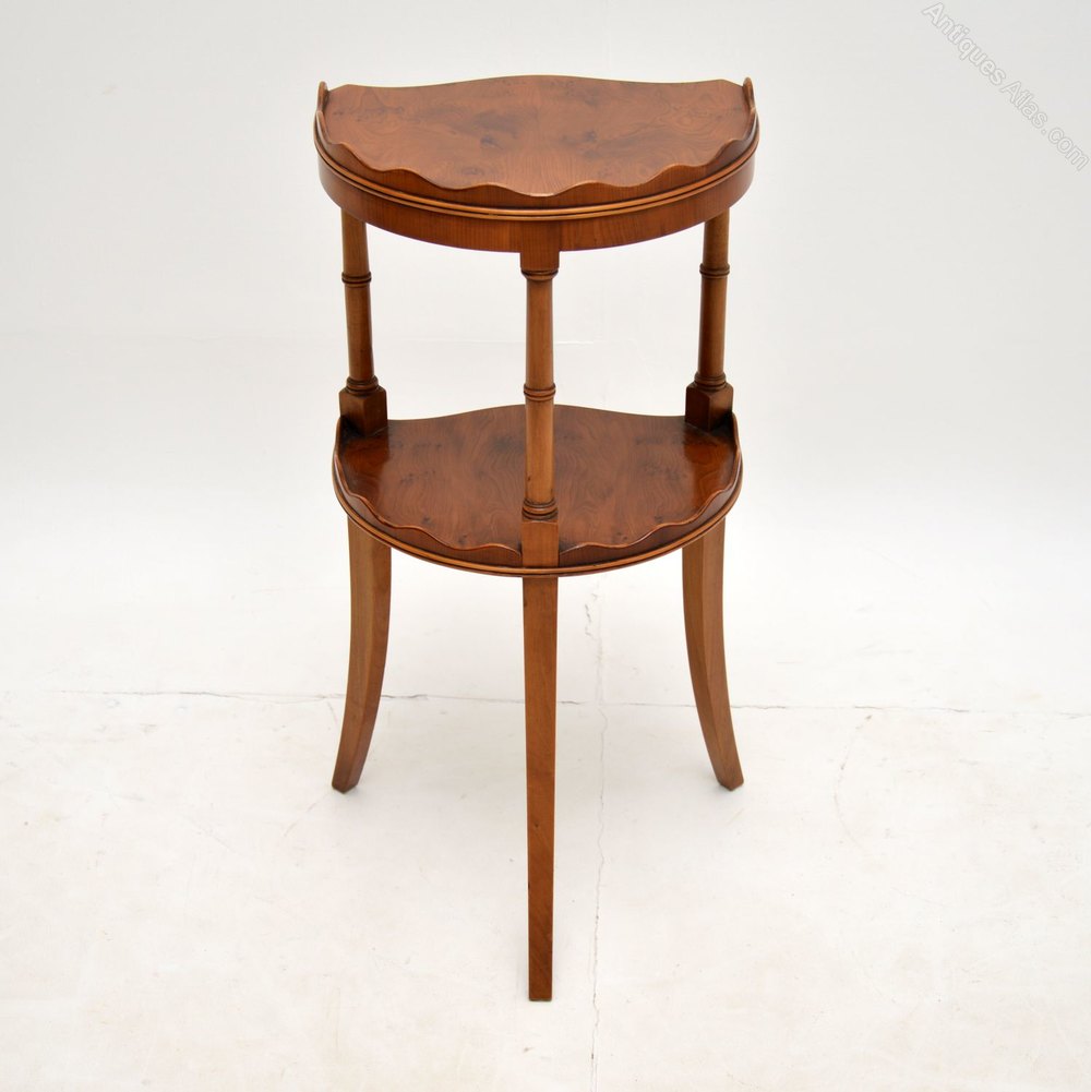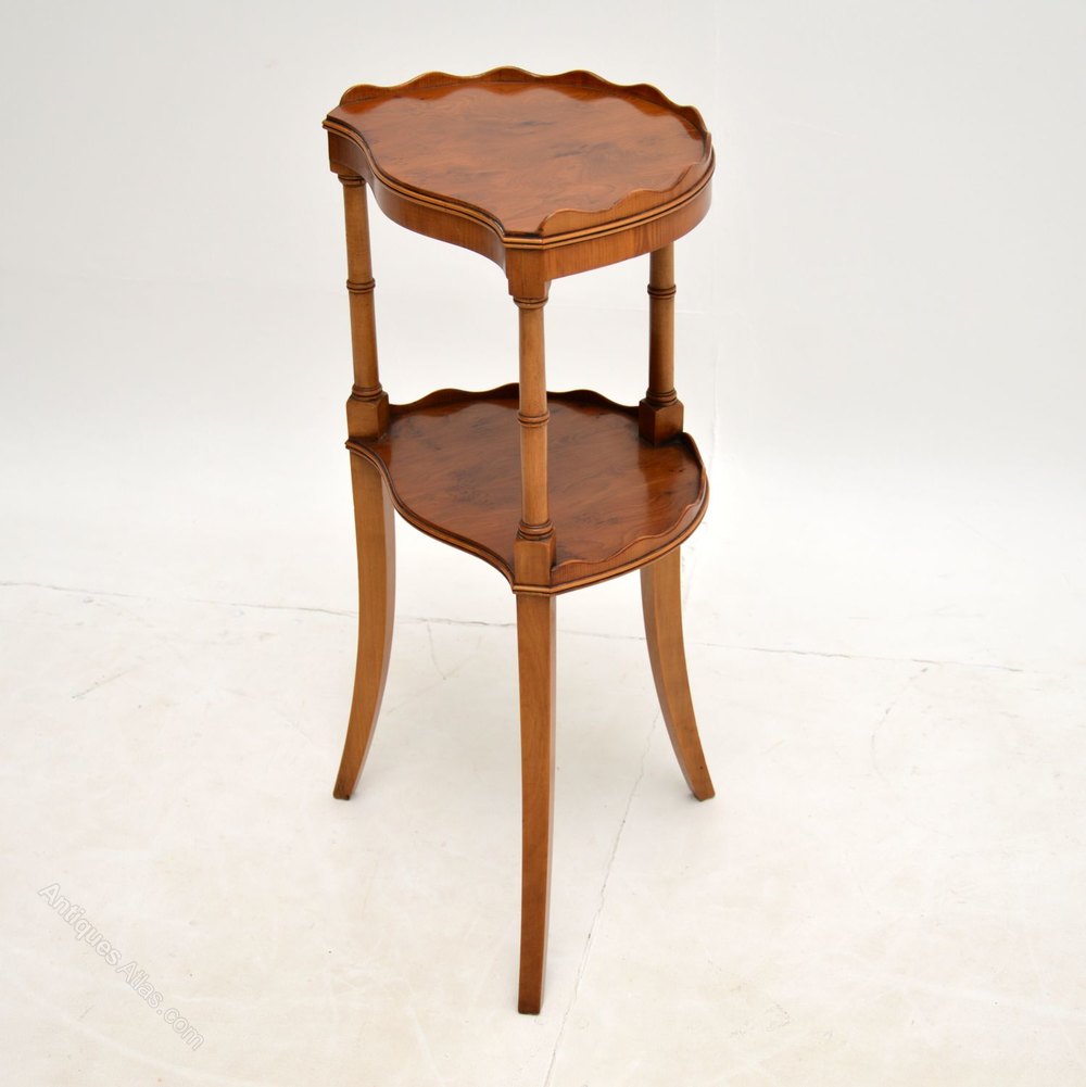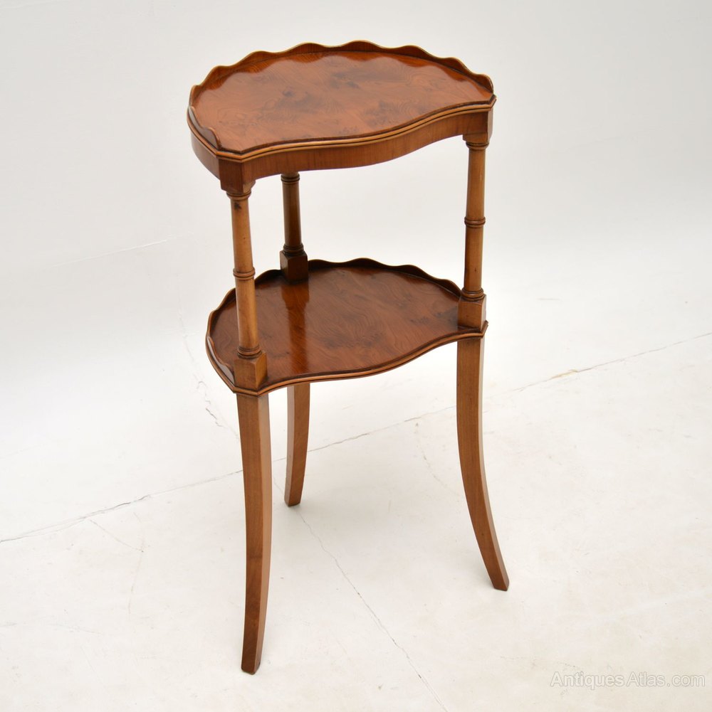 A charming yew wood two tier side table in the antique Sheraton style. This was made in England, it dates from around the 1950’s.