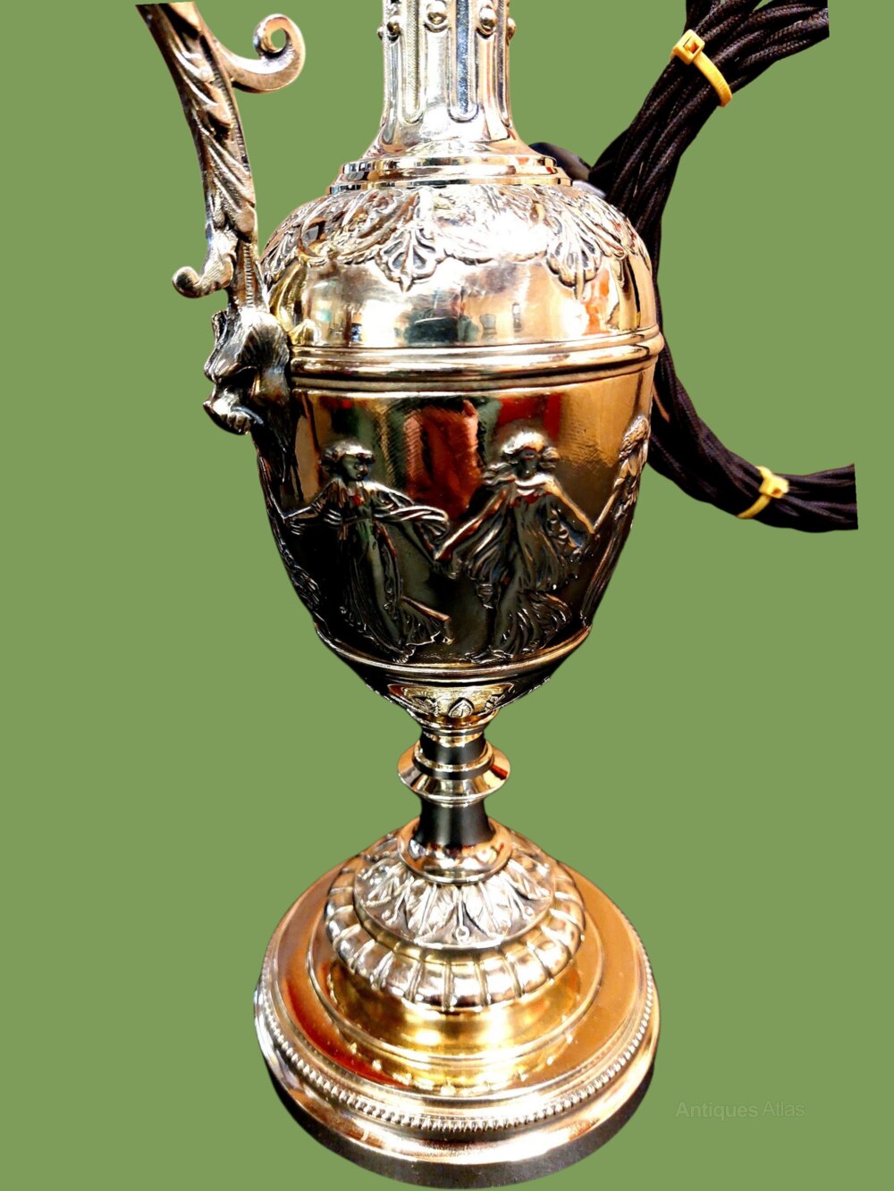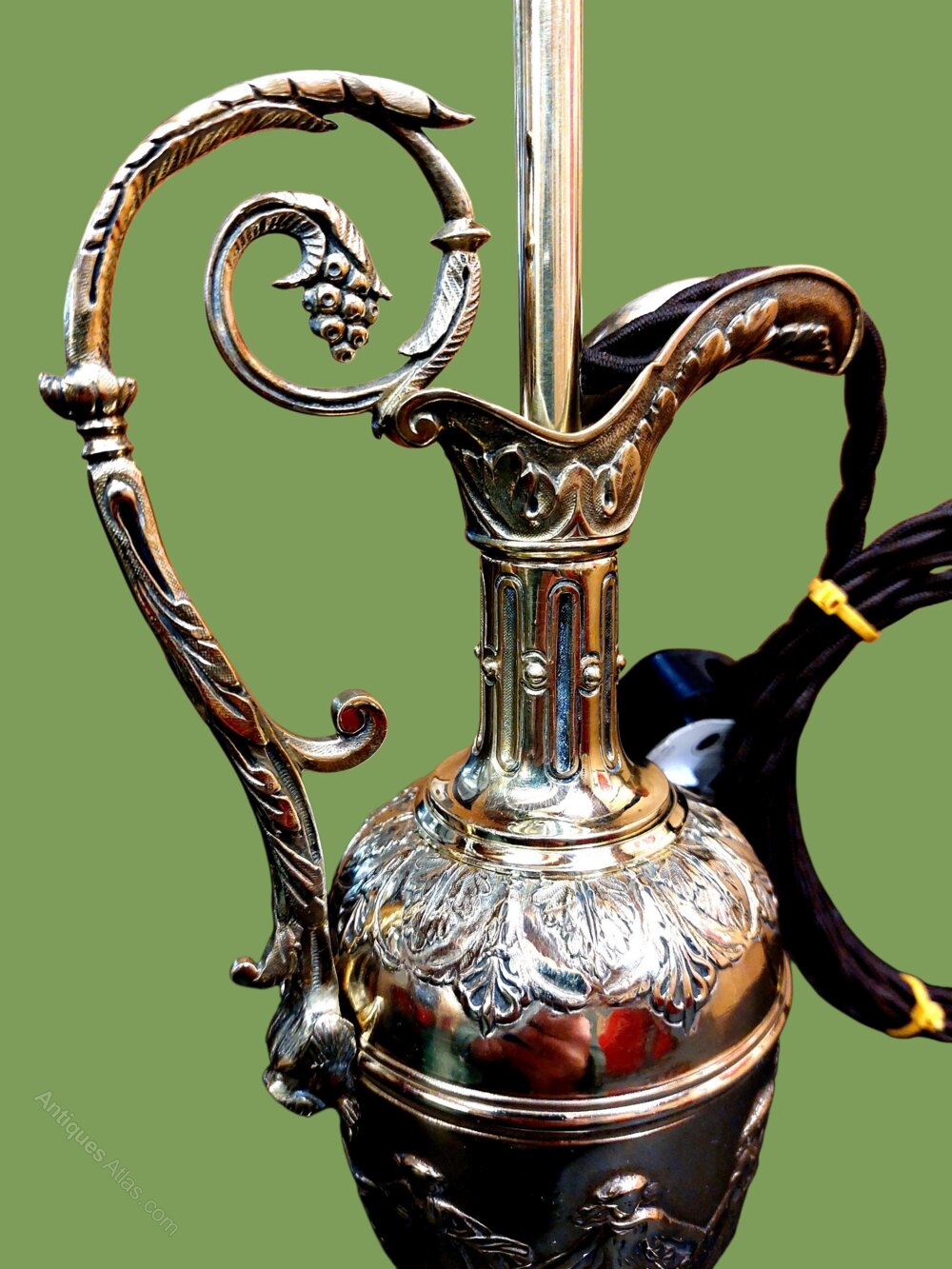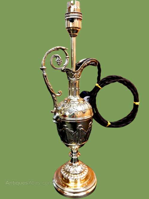 A superb fully restored 19th century English Renaissance Revival polished brass table lamp in the form of a wine ewer circa 1900. The body of the ewer shaped lamp is relief cast with dancing nymphs down to a circular base. Very heavy quality casting and craftsmanship second to none. This has always been a lamp and not a conversion. In excellent working order having been expertly cleaned polished and rewired in traditional braided flex in my workshop. Size 15 1/4" tall x 5" wide. Base 4 1/8" diameter.