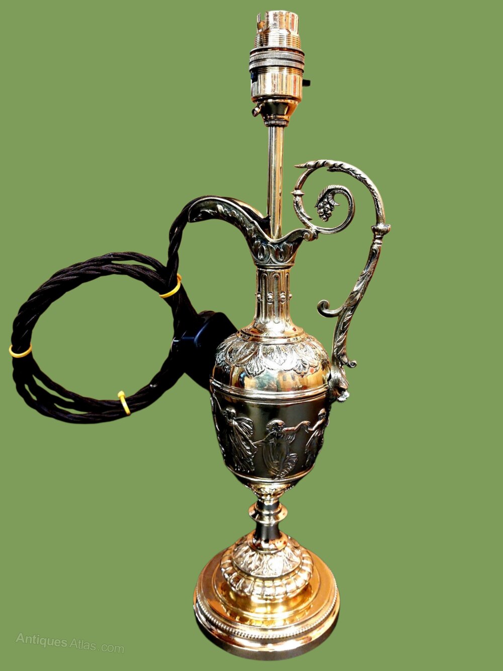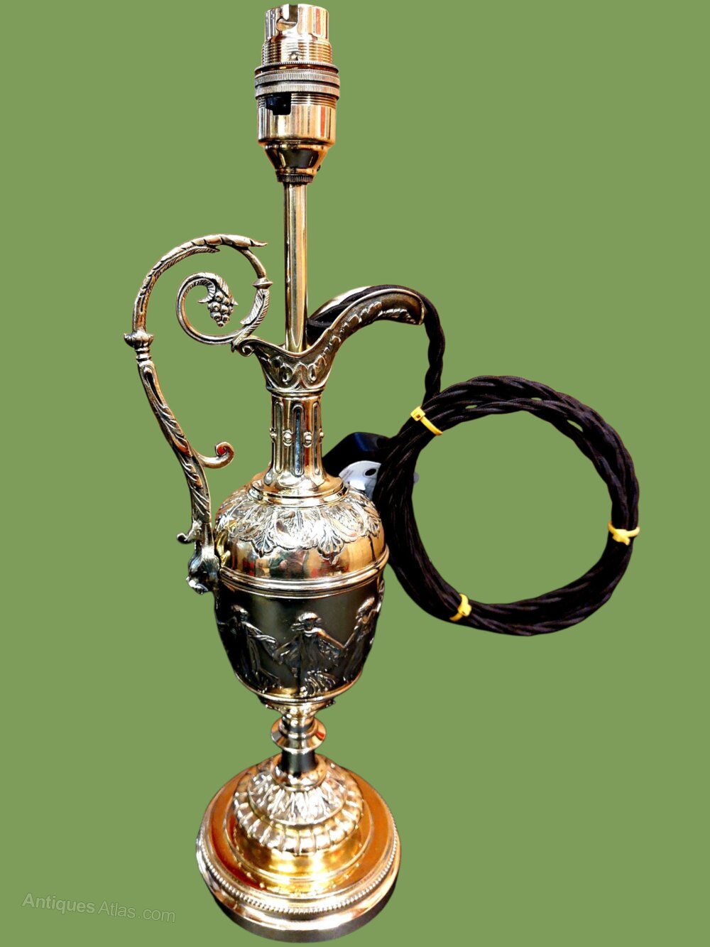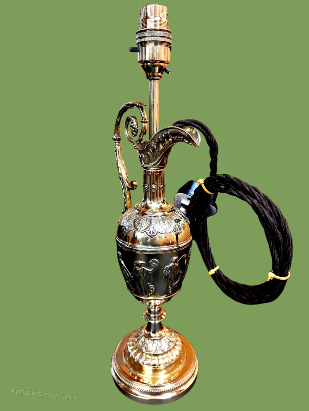 A superb fully restored 19th century English Renaissance Revival polished brass table lamp in the form of a wine ewer circa 1900. The body of the ewer shaped lamp is relief cast with dancing nymphs down to a circular base. Very heavy quality casting and craftsmanship second to none. This has always been a lamp and not a conversion. In excellent working order having been expertly cleaned polished and rewired in traditional braided flex in my workshop. Size 15 1/4" tall x 5" wide. Base 4 1/8" diameter.