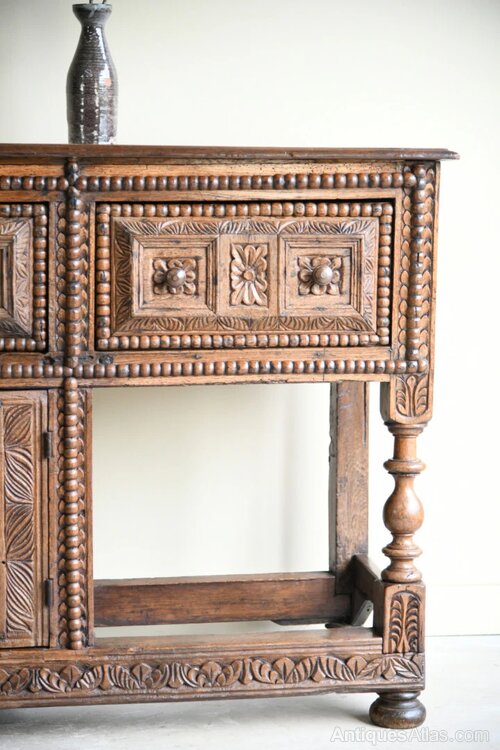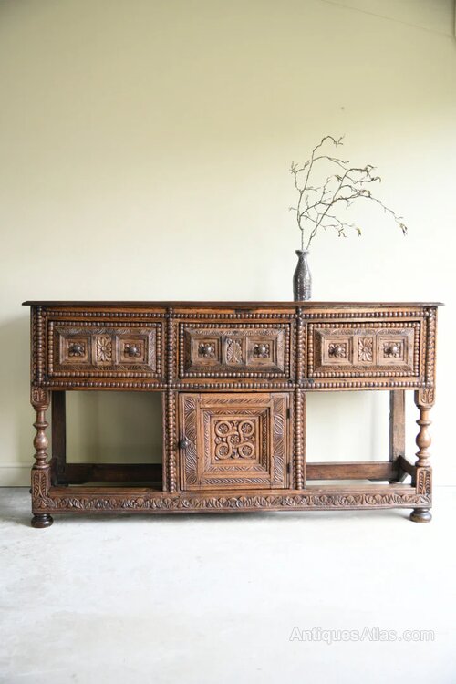 Antique Rustic Carved Oak Sideboard. 18th Century & later carved dresser base, the planked top with three carved drawers with geometric and beaded carved decortion below, above a central cupboard door with carved panel. The base is supported by turned legs and an open lower section with shaped supports, all finished with further carved ornament along the apron and on small bun feet. A substantial and decorative sideboard, ideal for a dining room or hallway, offering both storage and display space.