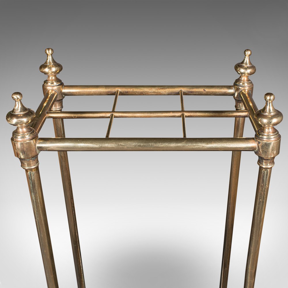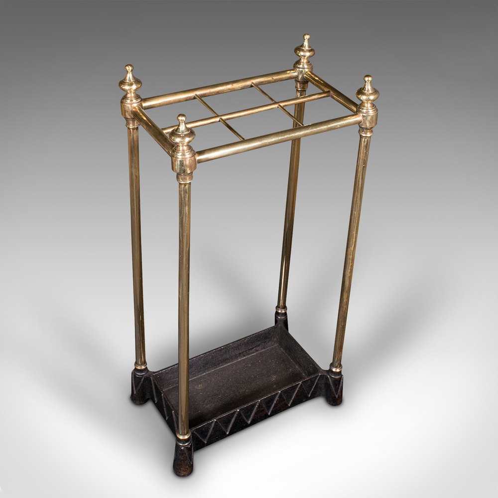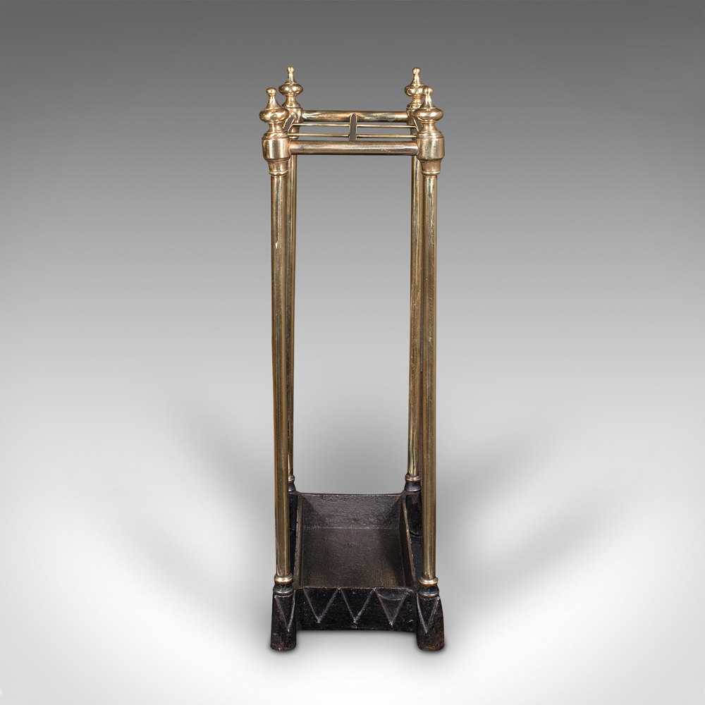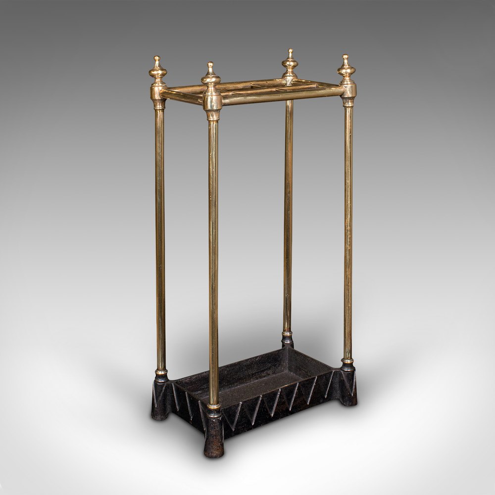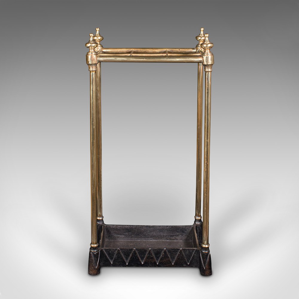 This is an antique segmented stick stand. An English, brass and cast iron hallway cane or umbrella rack, dating to the mid Victorian period, circa 1880.