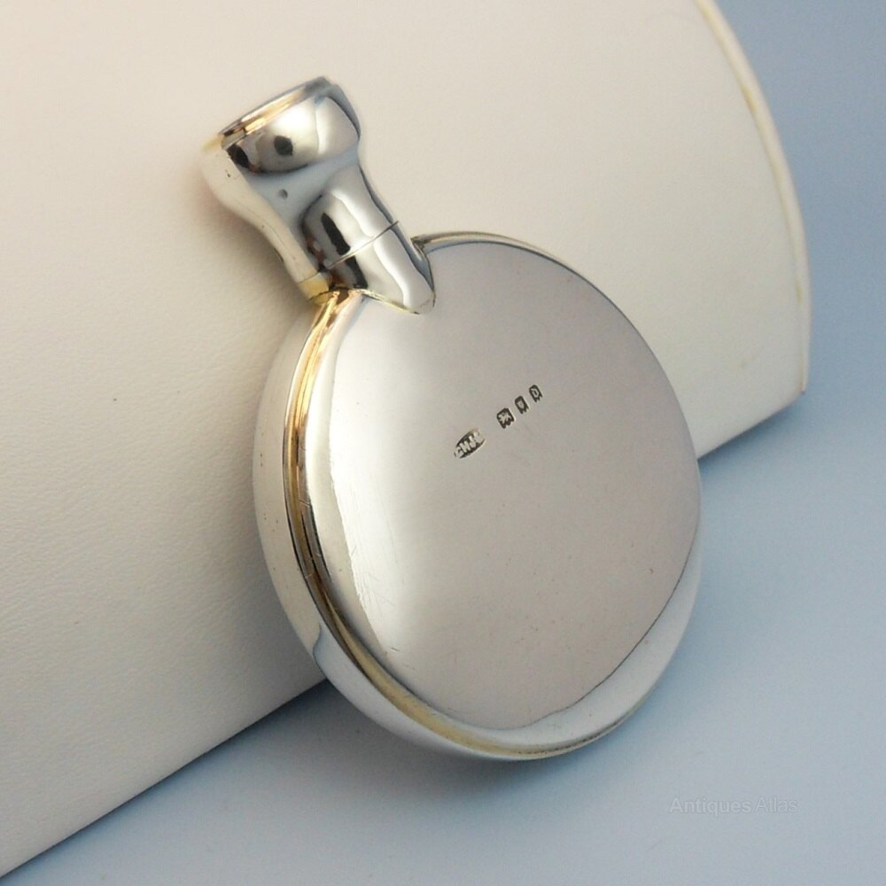 A simple and elegantly designed solid silver scent bottle in great antique collectors condition, there are some faint yellow marks around the edges of the rim suggesting that it may have been gilded at one point.