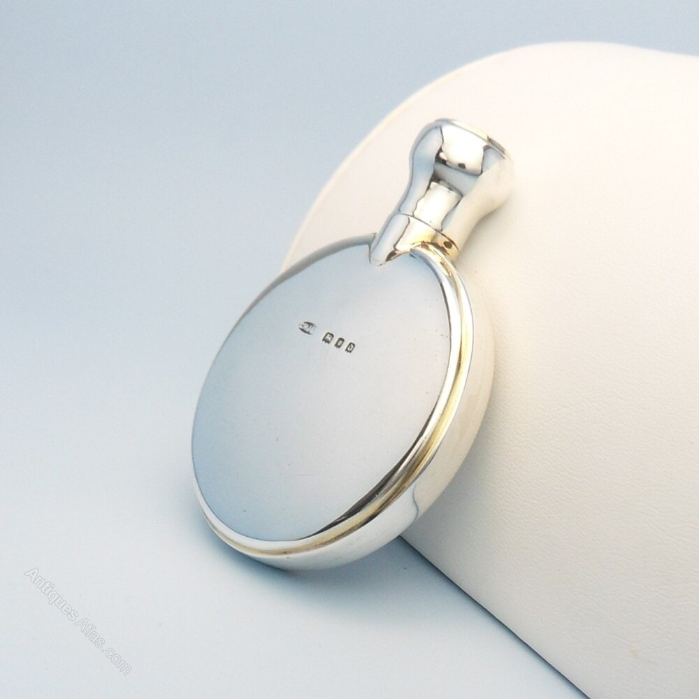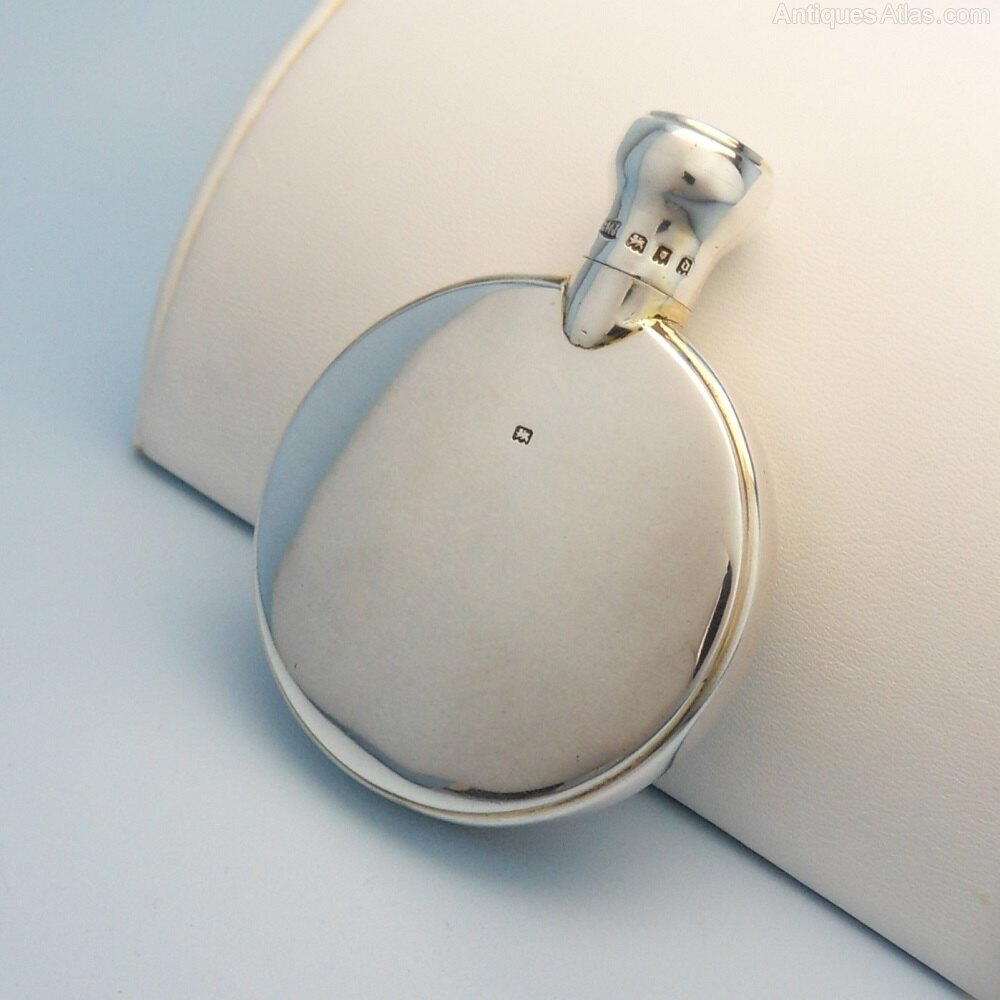 A lovely antique silver scent bottle. Circular, plain polished silver to the front and back with a screw top lid - the only details being a small rim around the edge and the hallmarks.