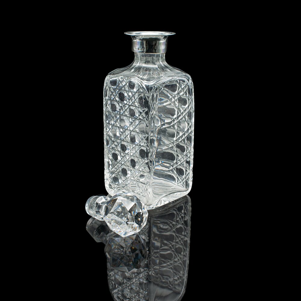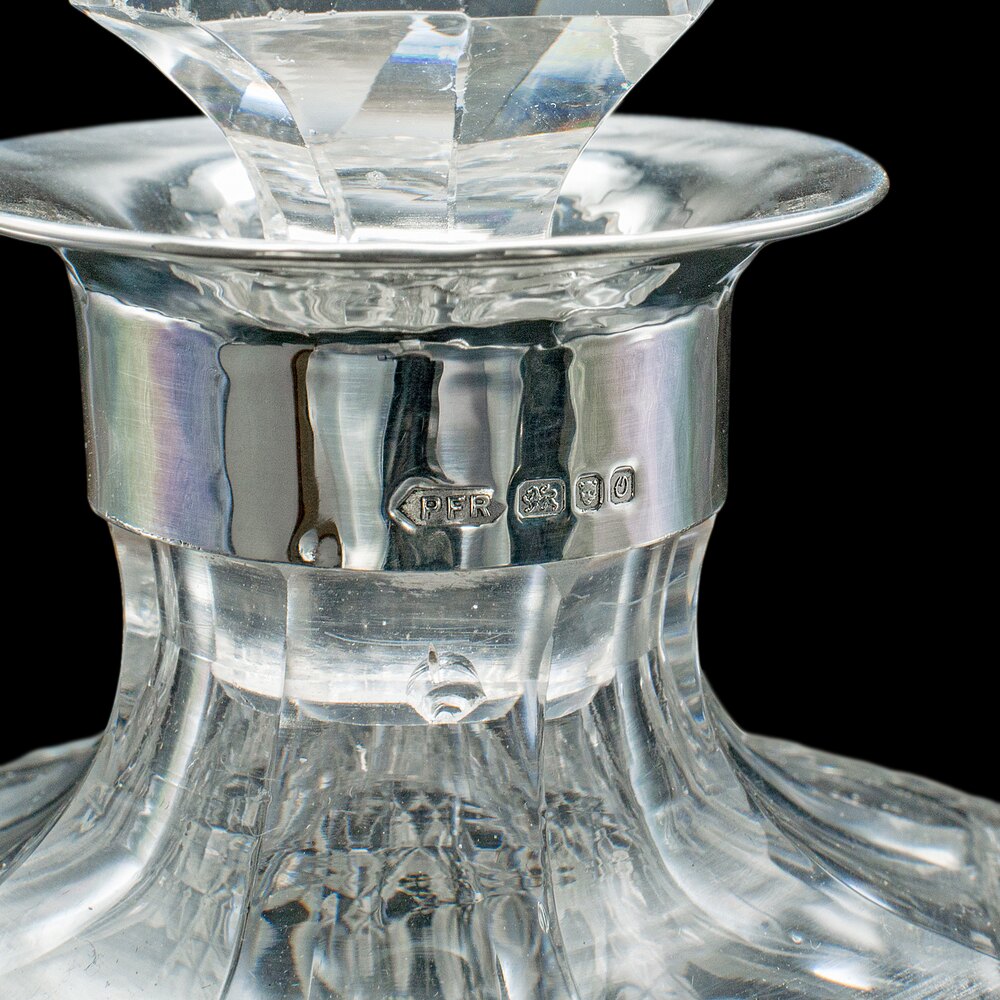Each decanter dressed with a hallmarked silver collar