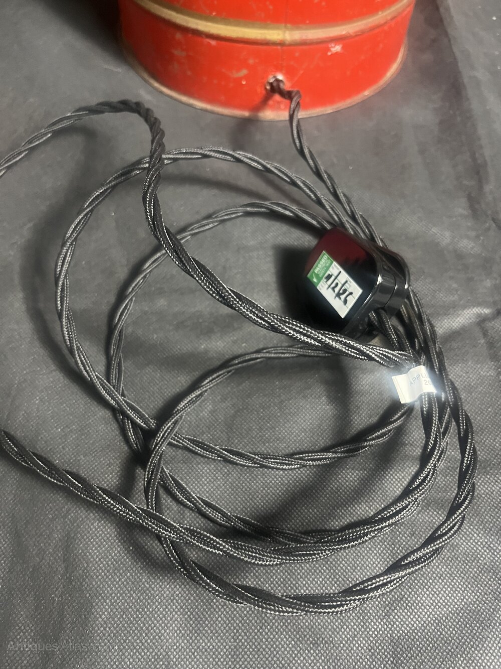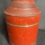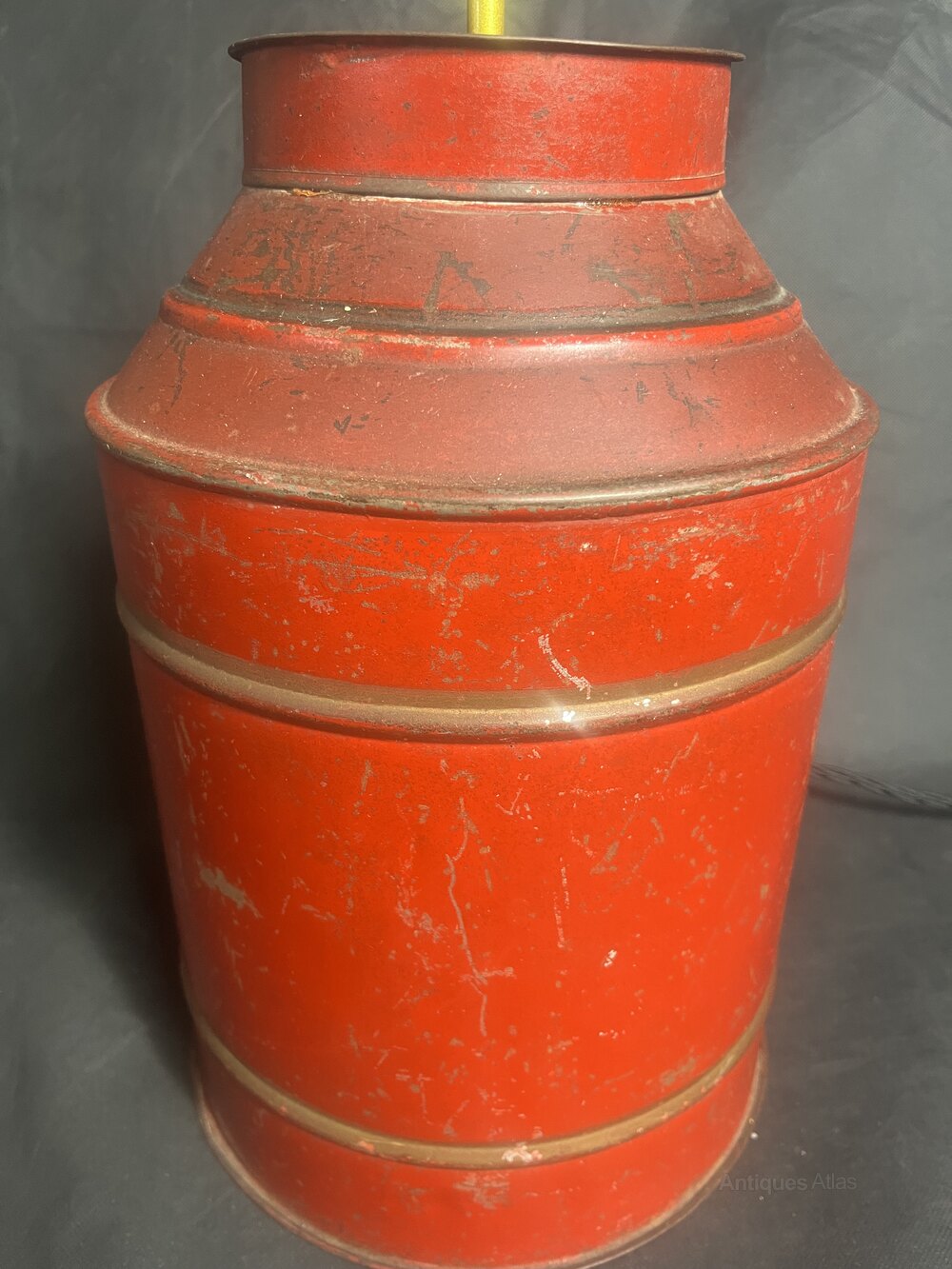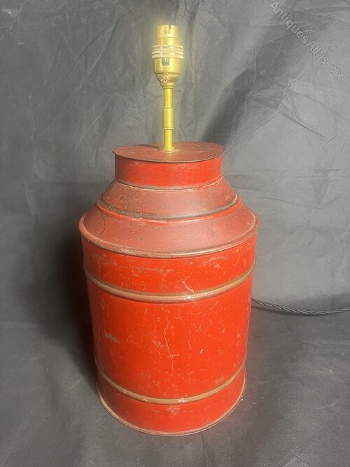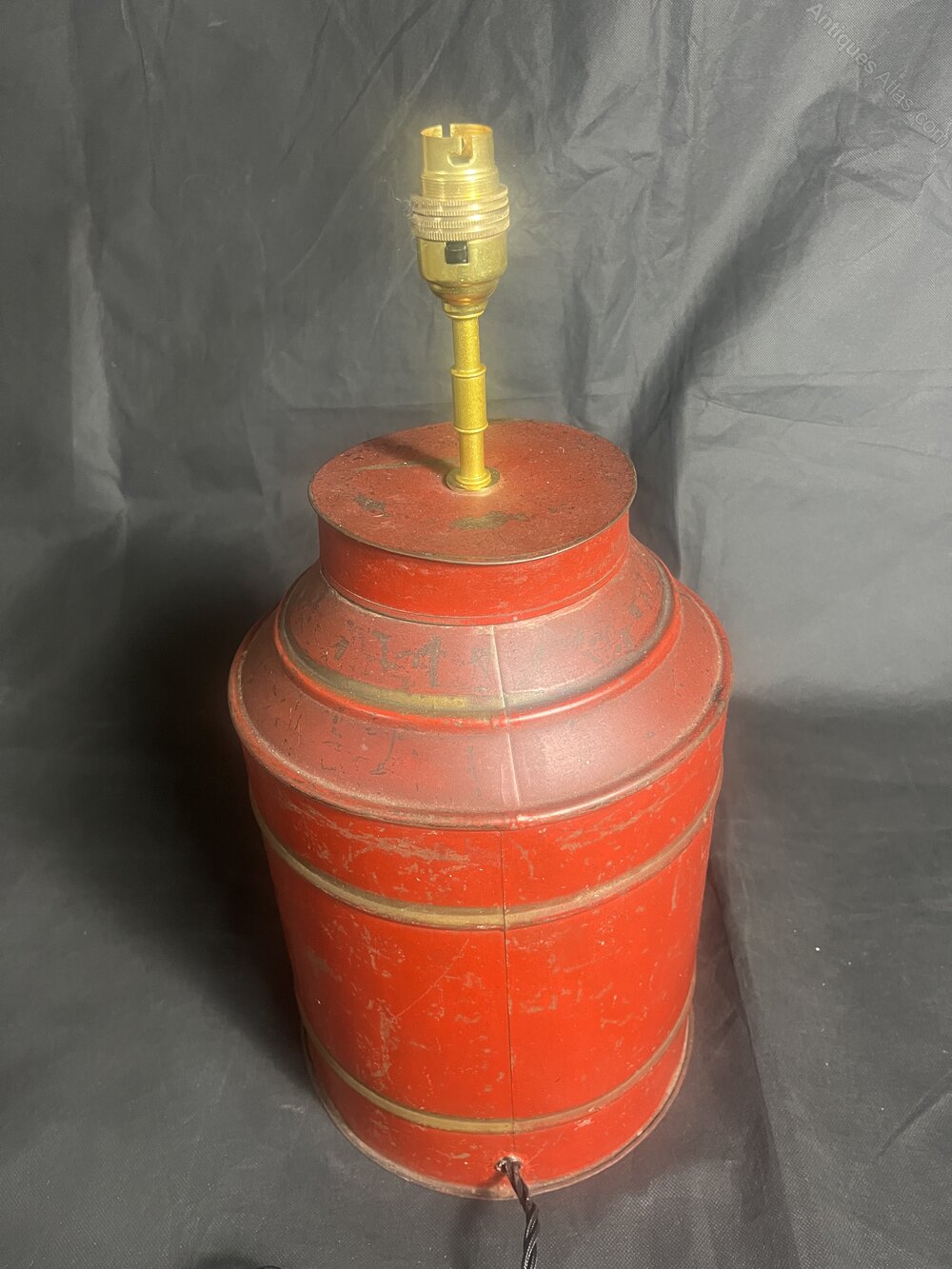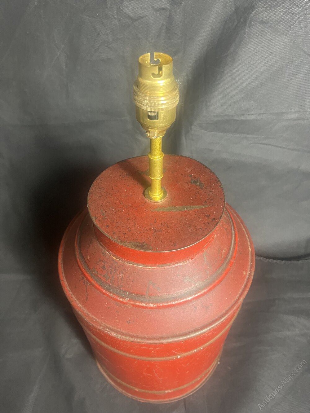 Antique tin tea cannister converted into a table lamp. Tea tin 34 cms tall, with brass electrical fittings and black flex. Fully rewired and PAT tested.