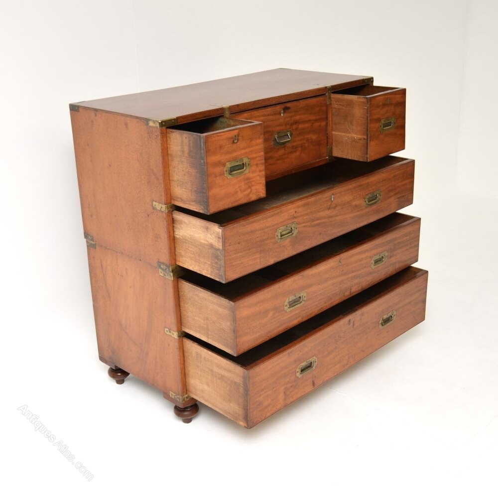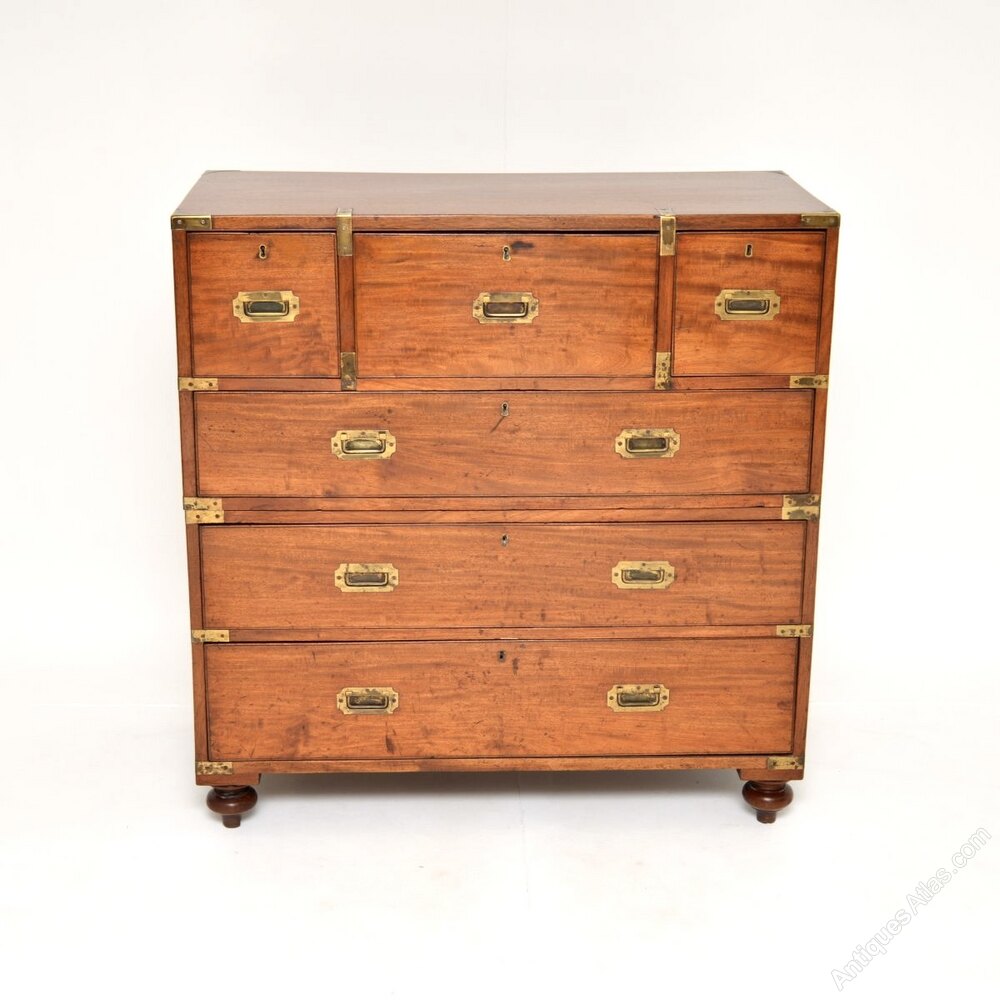 An outstanding antique teak military campaign secretaire chest of drawers, dating from around the 1860-1880 period.