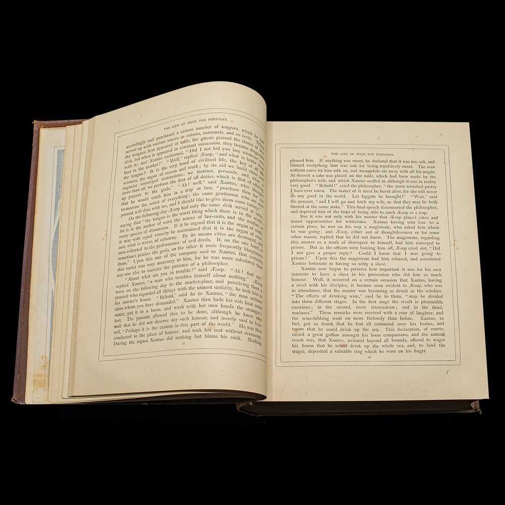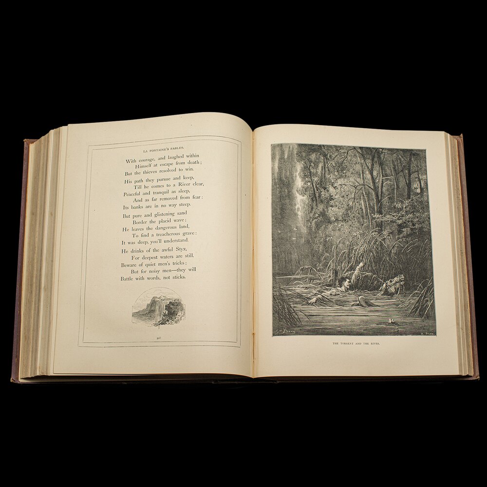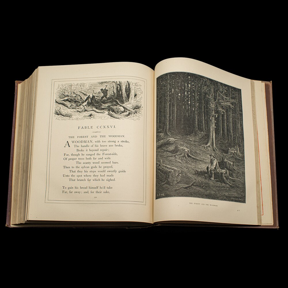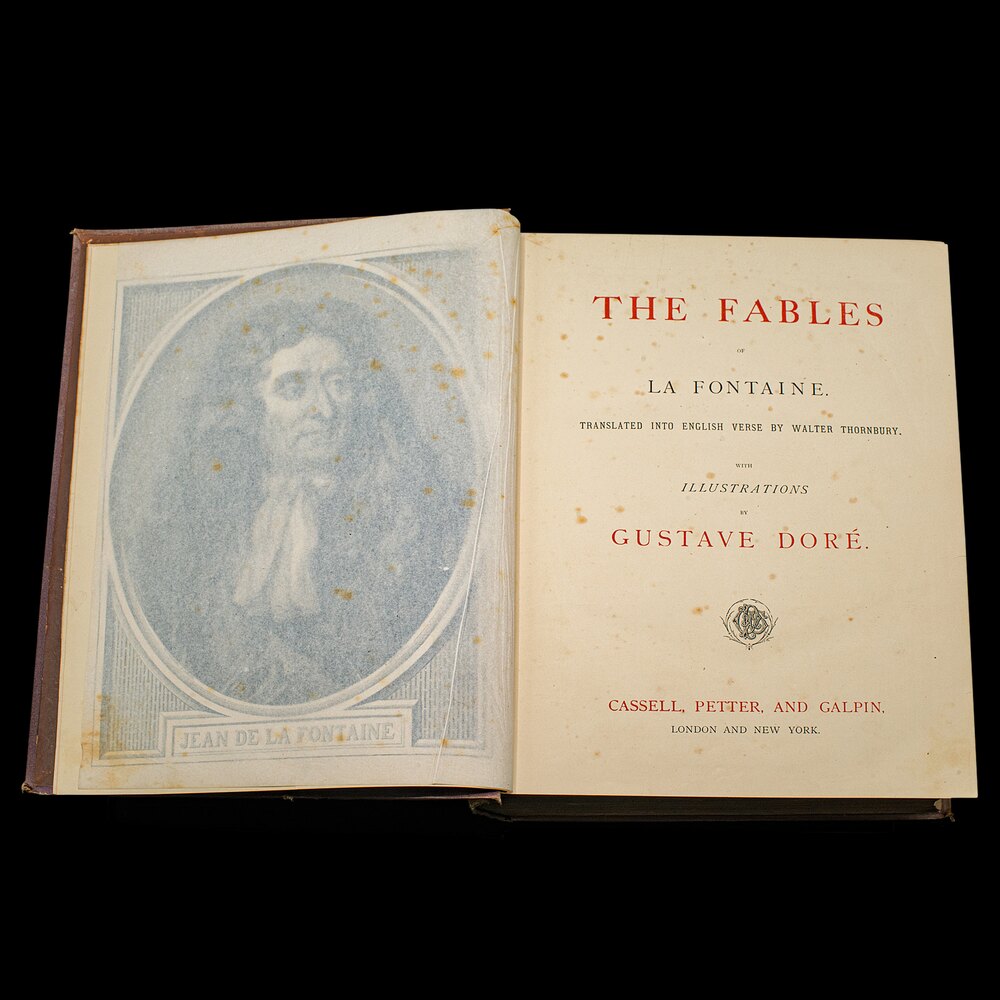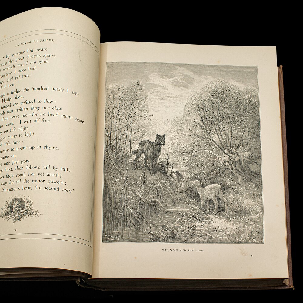 This is a superb antique edition of 'The Fables' by Jean de La Fontaine, translated into English verse by Walter Thornbury and illustrated throughout by Gustave Doré. A fine, intact circa 1870 Victorian copy with charming light markings, encapsulating the enduring appeal of this celebrated literary classic.
