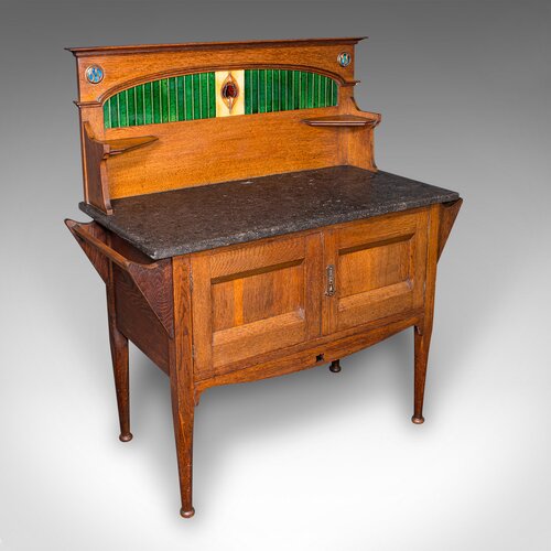 A distinguished late Victorian washstand, marrying oak craftsmanship, granite luxury, and Arts & Crafts design sensibility and a wonderful accoutrement for a refined bathroom or period townhouse interior. Solid joints and construction, delivered ready for the home.
