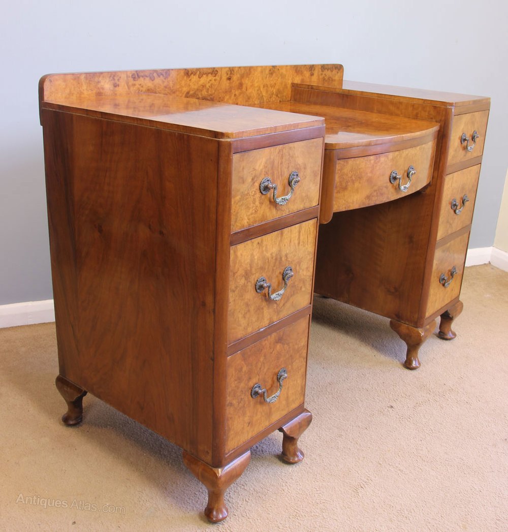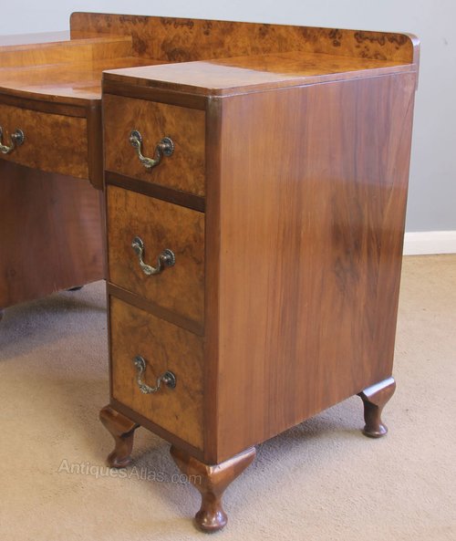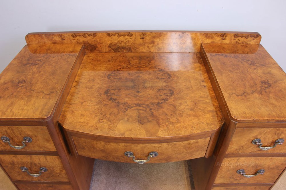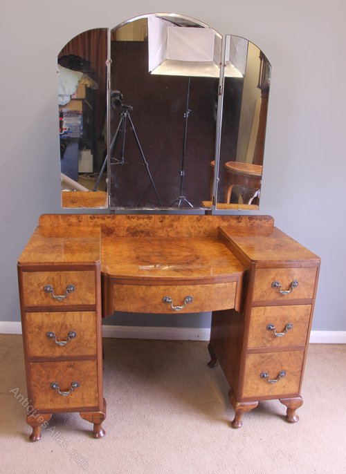 Antique Triple Mirror Burr Walnut Dressing Table. This lovely burr walnut triple mirror dressing table has three shaped mirrors with a low upstand under. The low upstand and the top of the dressing table is finished in wonderful burr walnut. Under having a bowed shaped centre drawer with three drawers either side the drawer fronts all finished with lovely burr walnut. All supported by short queen anne style legs. Slight marks in mirror.