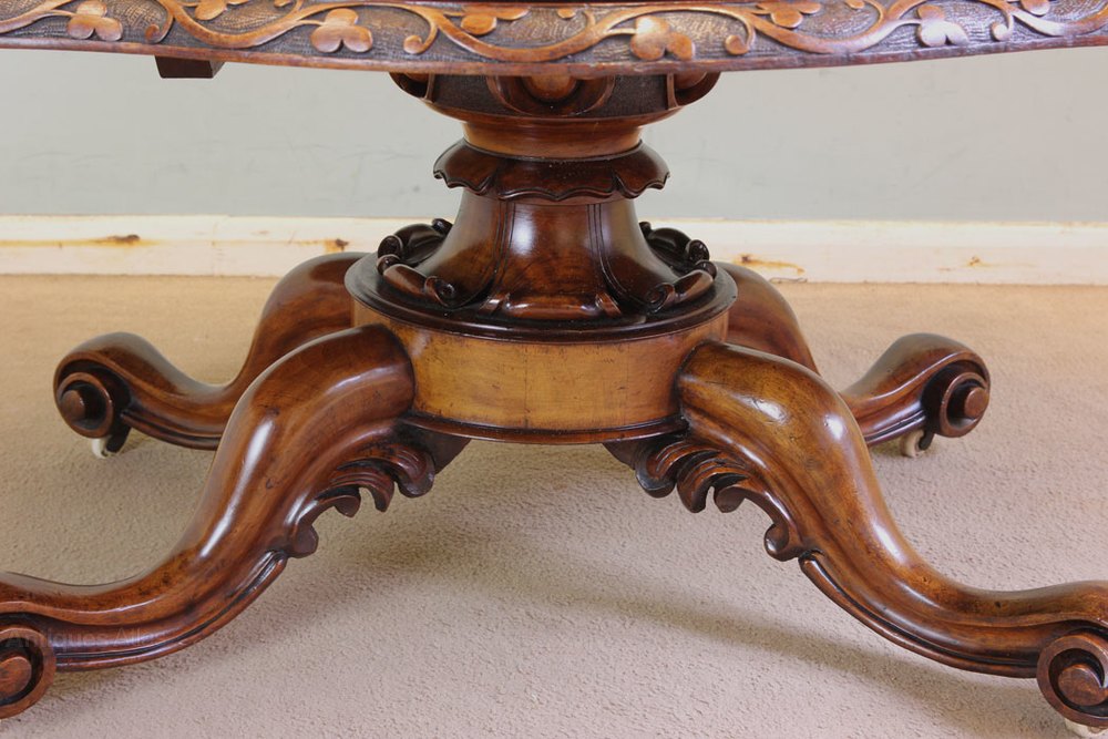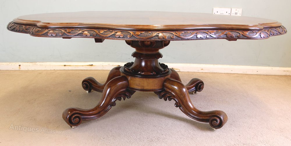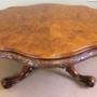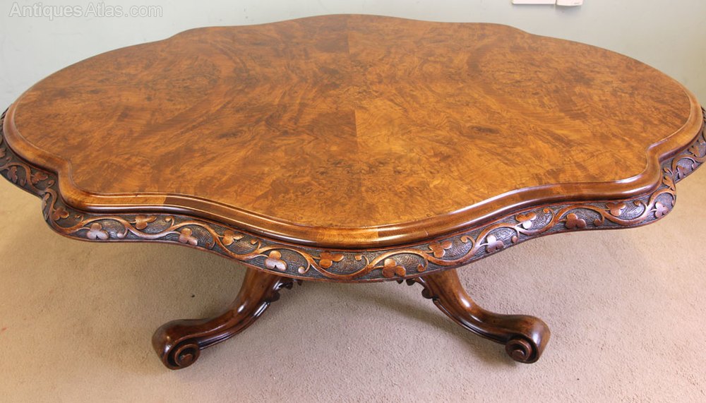 Antique Victorian Burr Walnut Coffee Table. This wonderful Victorian burr walnut shaped coffee table has a lovely shaped top with moulded and carved edge and beautiful burr walnut top. All supported by a turned and scroll centre column and four shaped legs with carved detail with castors under. This table has been reduced in height at sometime.
