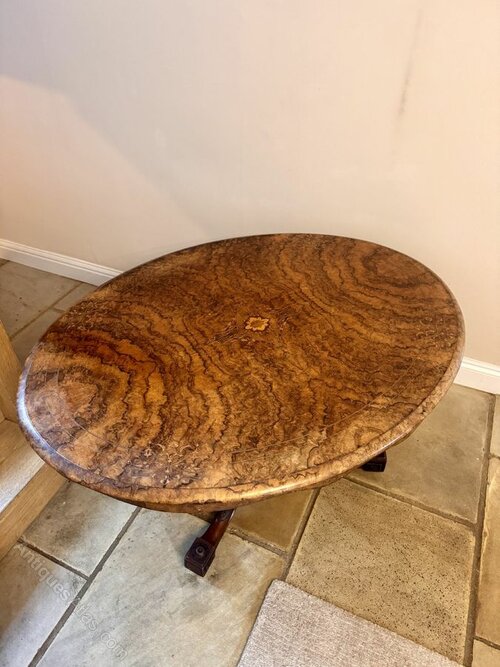 Fine quality antique Victorian well figured quarter veneered burr walnut oval loo table, having a polished burr walnut oval shaped top above four turned and fitted supports finished with beautiful carved downswept legs raised on the original castors.