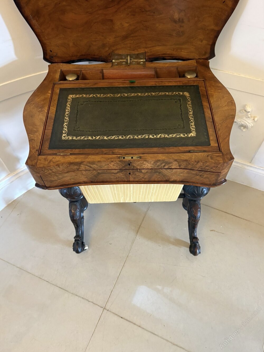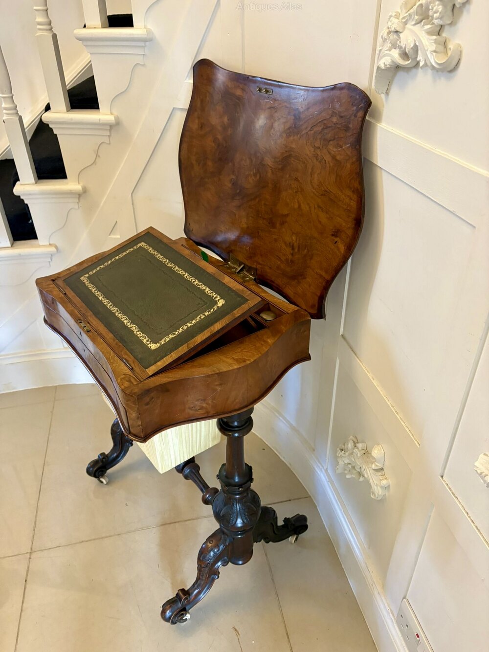 Outstanding quality antique Victorian burr walnut sewing and writing/lamp table having a quality burr walnut shaped lift up top with a moulded edge opening to reveal a pair of ink wells, pen tray and a green leather writing surface above a single fitted sewing drawer supported by two carved walnut columns standing on shaped carved cabriole legs with original porcelain castors united by a carved walnut stretcher.